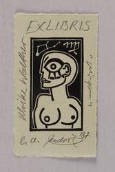 1987. Linolschnitt, in Schwarz, auf gelbgrau getöntem Hahnemühle. – Exlibris, von Hendrik Hause. – Künstlerexemplar (e.a.). – 6,7 x 3,8 cm (Darstellung / Druckbild), 10,2 x 6,0 cm (Blatt).