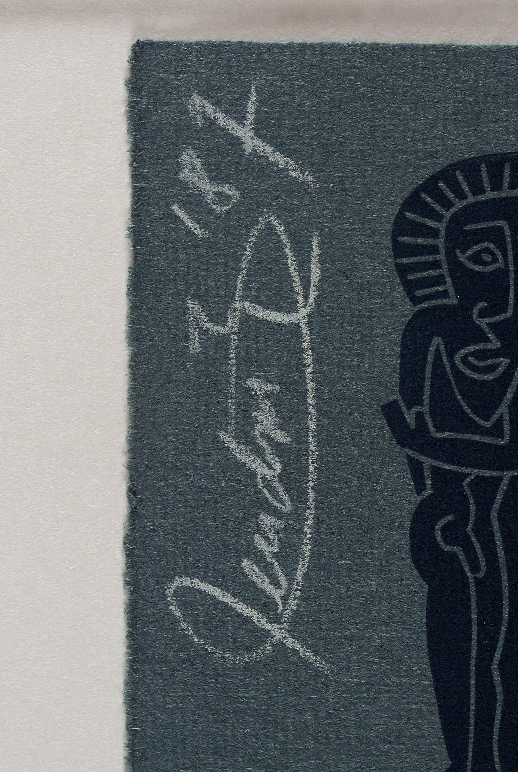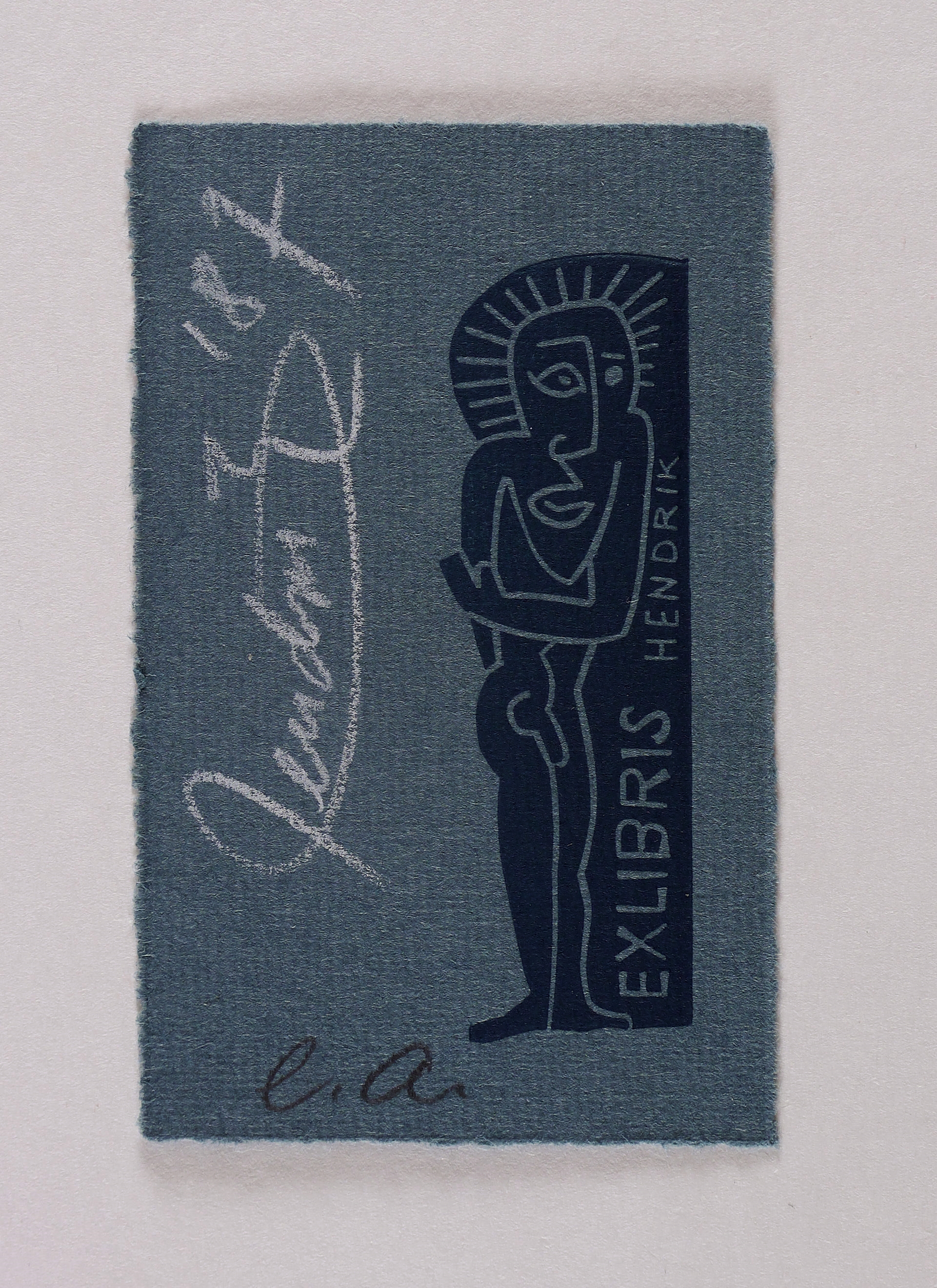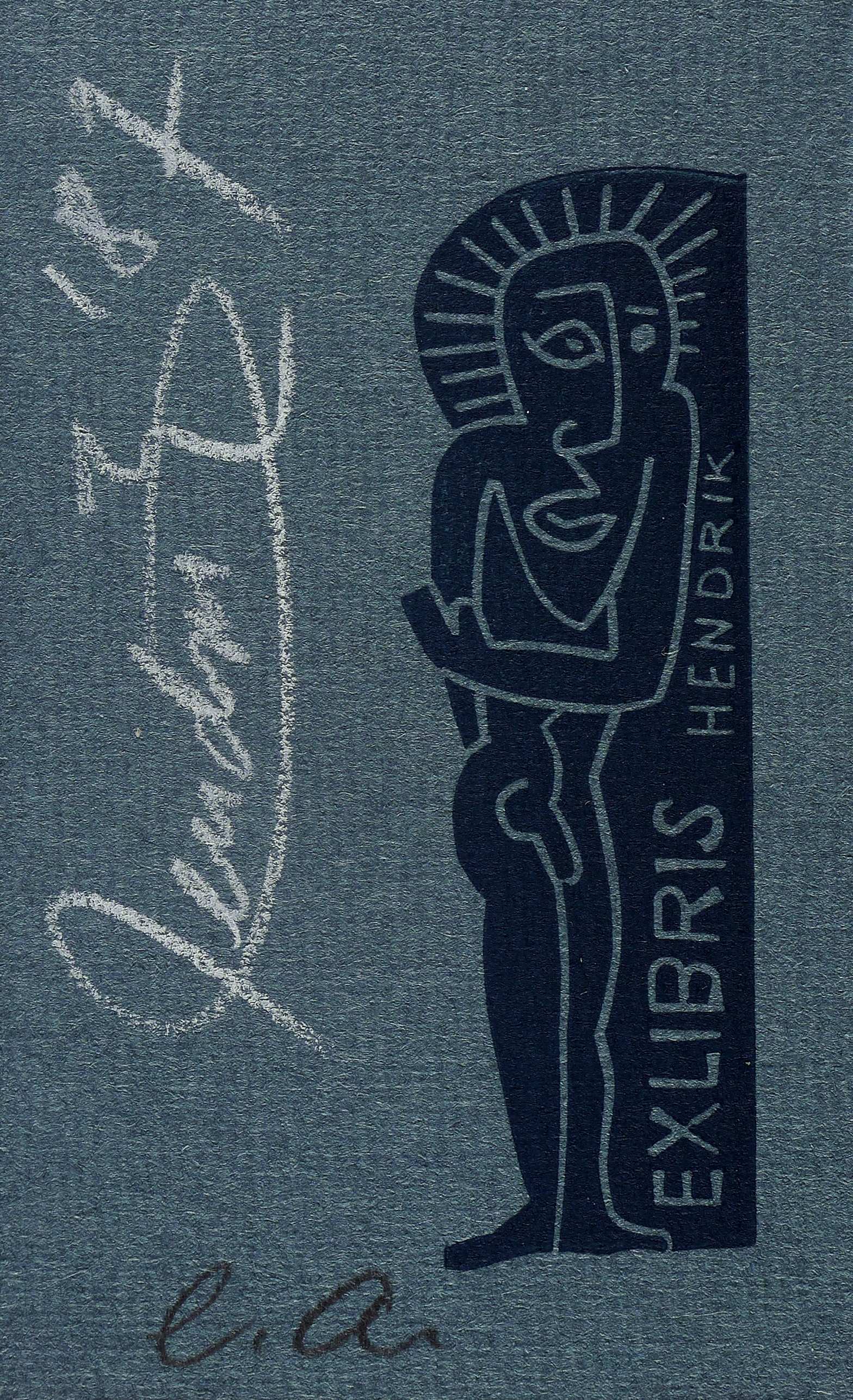 Links oben in Farbkreide signiert und datiert: ″hendrik 87″. Links unten Auflagenbezeichnung: ″e.a.″ Im Druckstock Inschrift: ″EXLIBRIS HENDRIK″. – Sehr guter Zustand.
