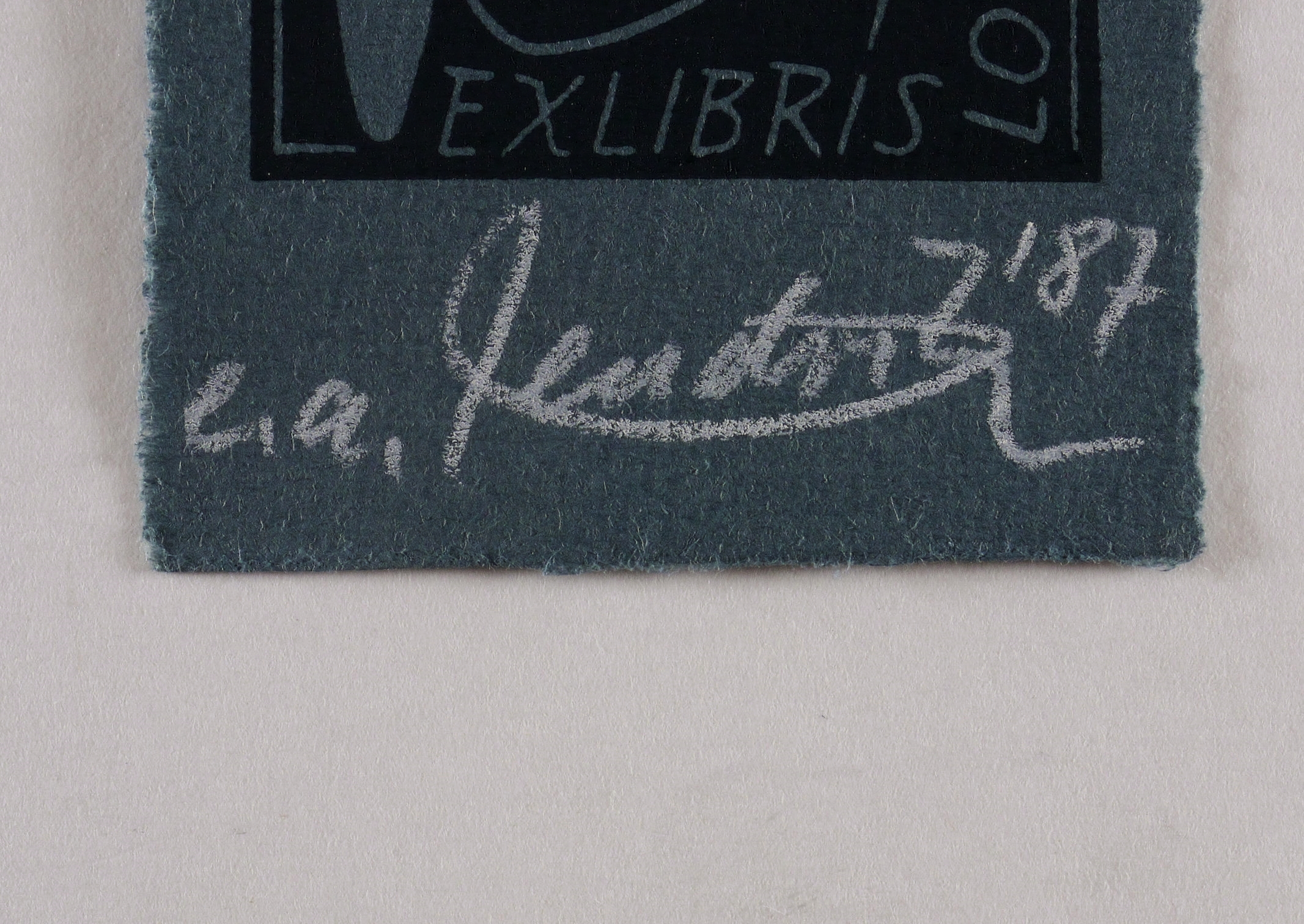 1987. Linolschnitt, in Schwarz, auf dunkel blaugrau getöntem Hahnemühle. – Exlibris, von Hendrik Hause. – Künstlerexemplar (e.a.). – 7,3 x 5,0 cm (Darstellung / Druckbild), 10,0 x 6,3 cm (Blatt).