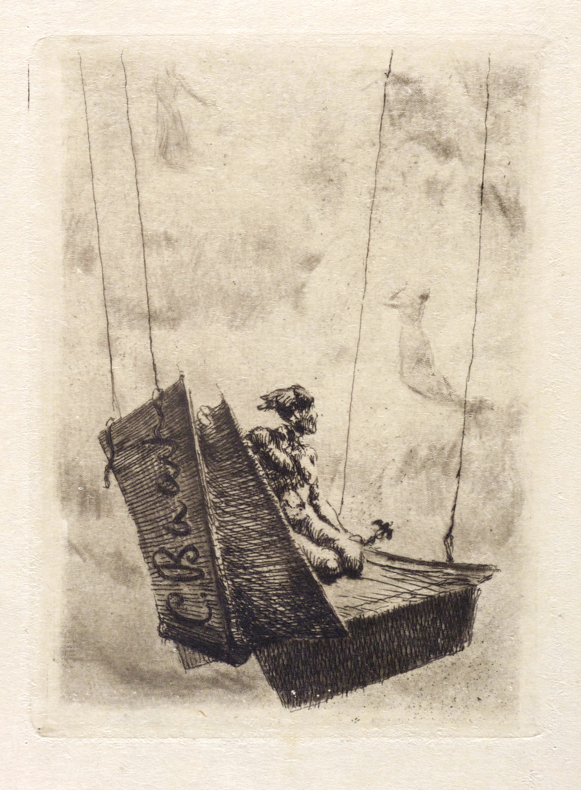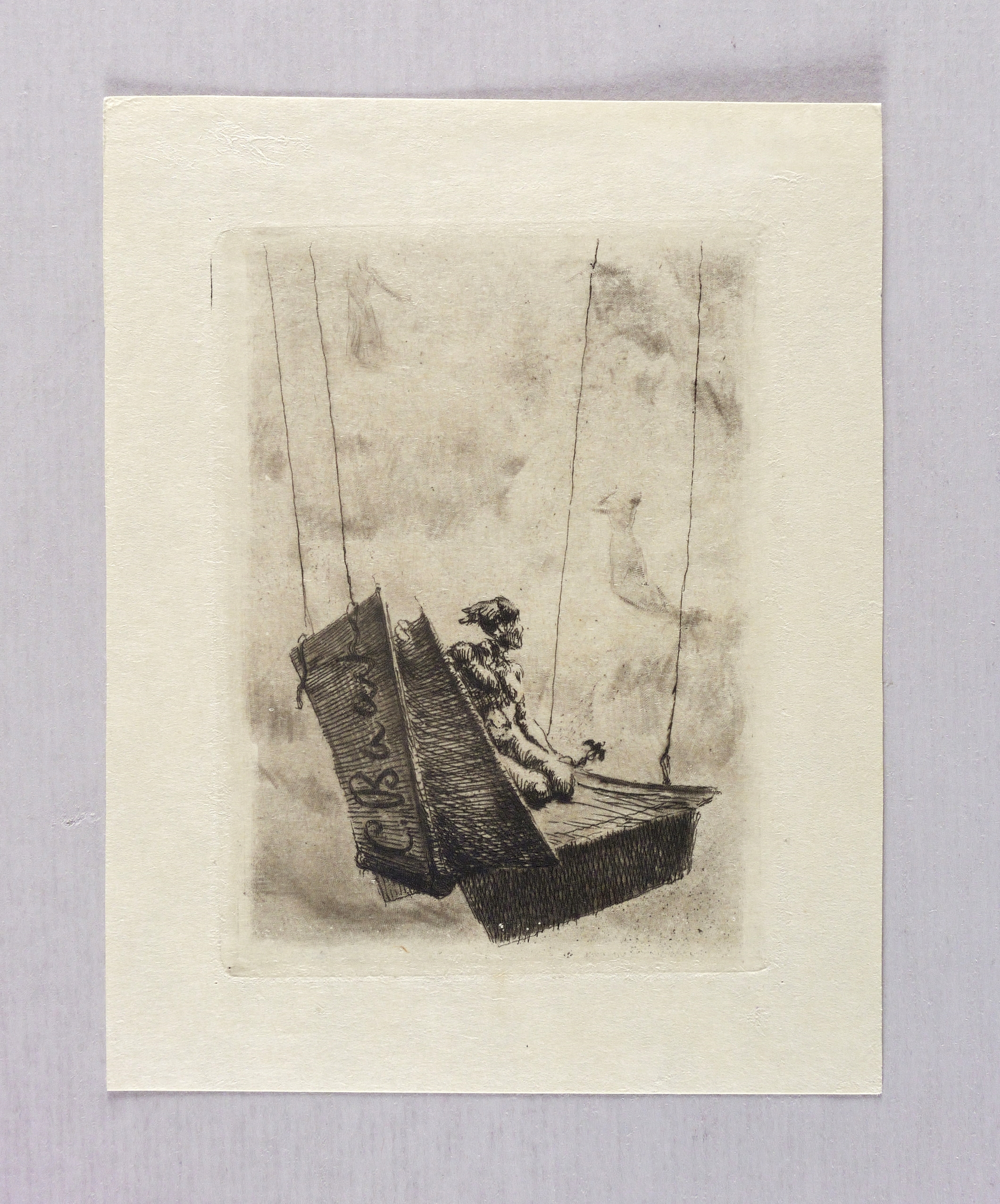 1920-1930. Radierung / Strichätzung & Kaltnadel, mit Plattenton, in Braun, auf hellgelbem Velin. – Exlibris, von Walter Richard Rehn. – 11,9 x 8,7 cm (Darstellung / Platte), 16 x 13 cm (Blatt).