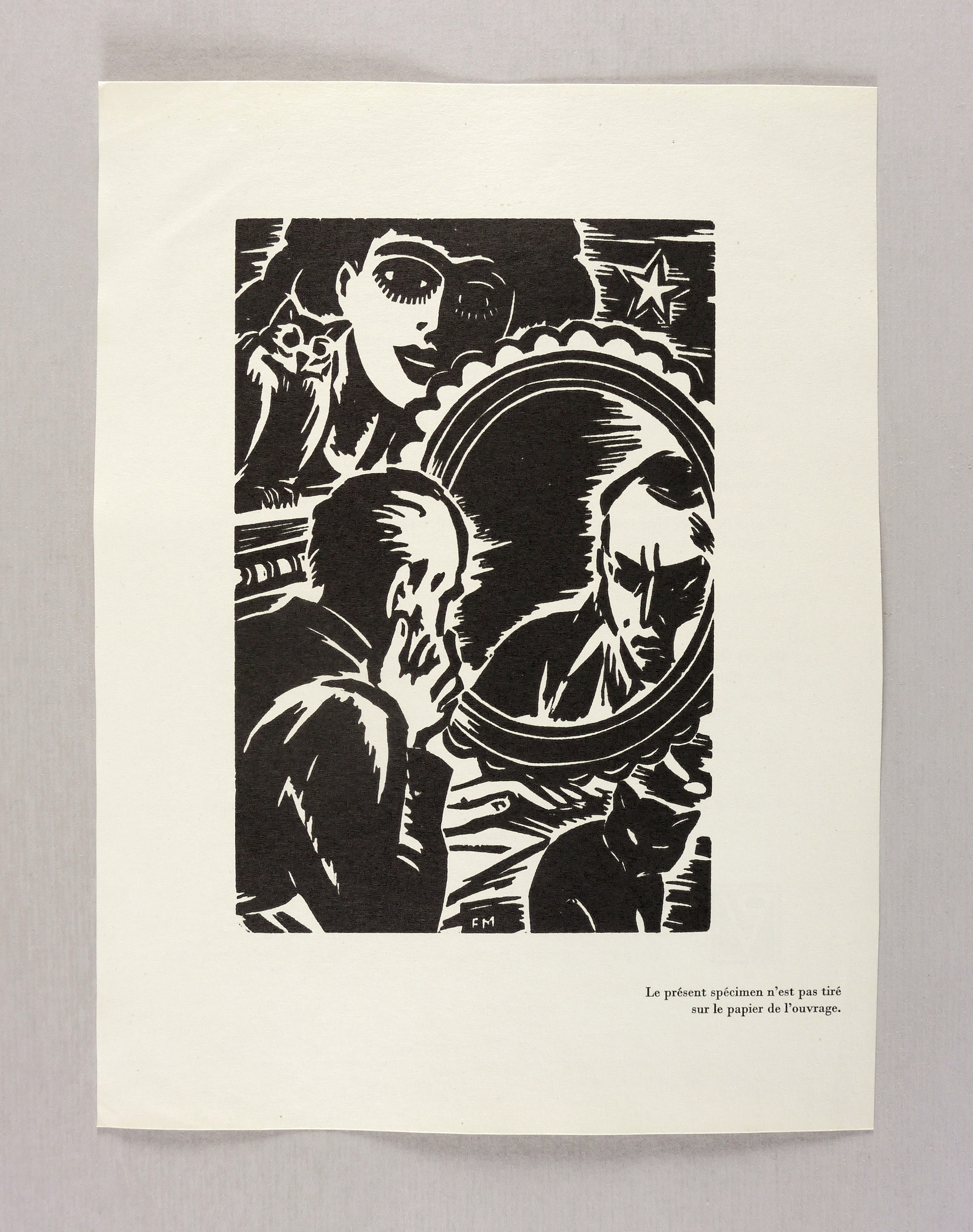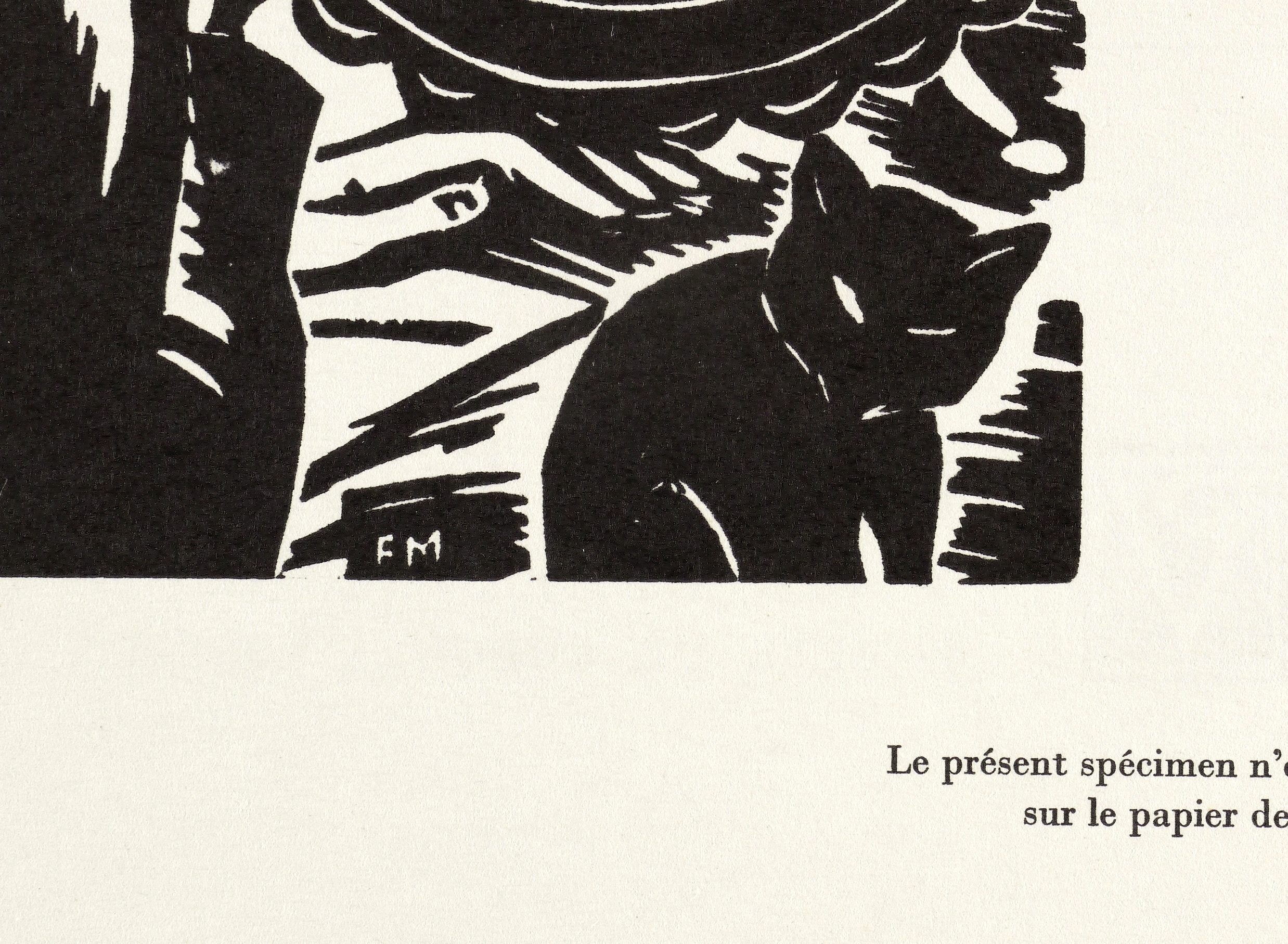Nicht handsigniert. Im Druckstock unten Monogramm: ″FM″. Rechts unten typografisch bezeichnet: ″Le présent spécimen n'est par tiré sur le papier de l'ouvrage.″ Französischer Rückentext. Dazu Verlagsadresse von Pierre Vorms, Belvès, Frankreich. – Provenienz: Sammlung Erhard Frommhold, Dresden. – Tadellos erhalten. Sehr guter Zustand.
