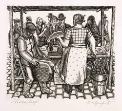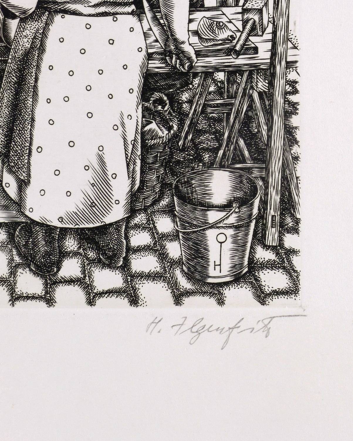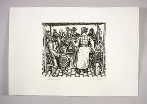 Rechts unten in Bleistift signiert: ″H. Ilgenfritz″. Links Titel: ″Fischverkauf″. In der Platte gestochenes Monogramm. – Tadellos. Sehr guter Zustand.