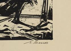 1974. Linolschnitt, in Schwarz, auf beige getöntem Velin. – Originale Künstlergrafik, von Engelbert Schoner. – 31,8 x 30,1 cm (Darstellung / Druckstock), 38 x 41 cm (Blatt).