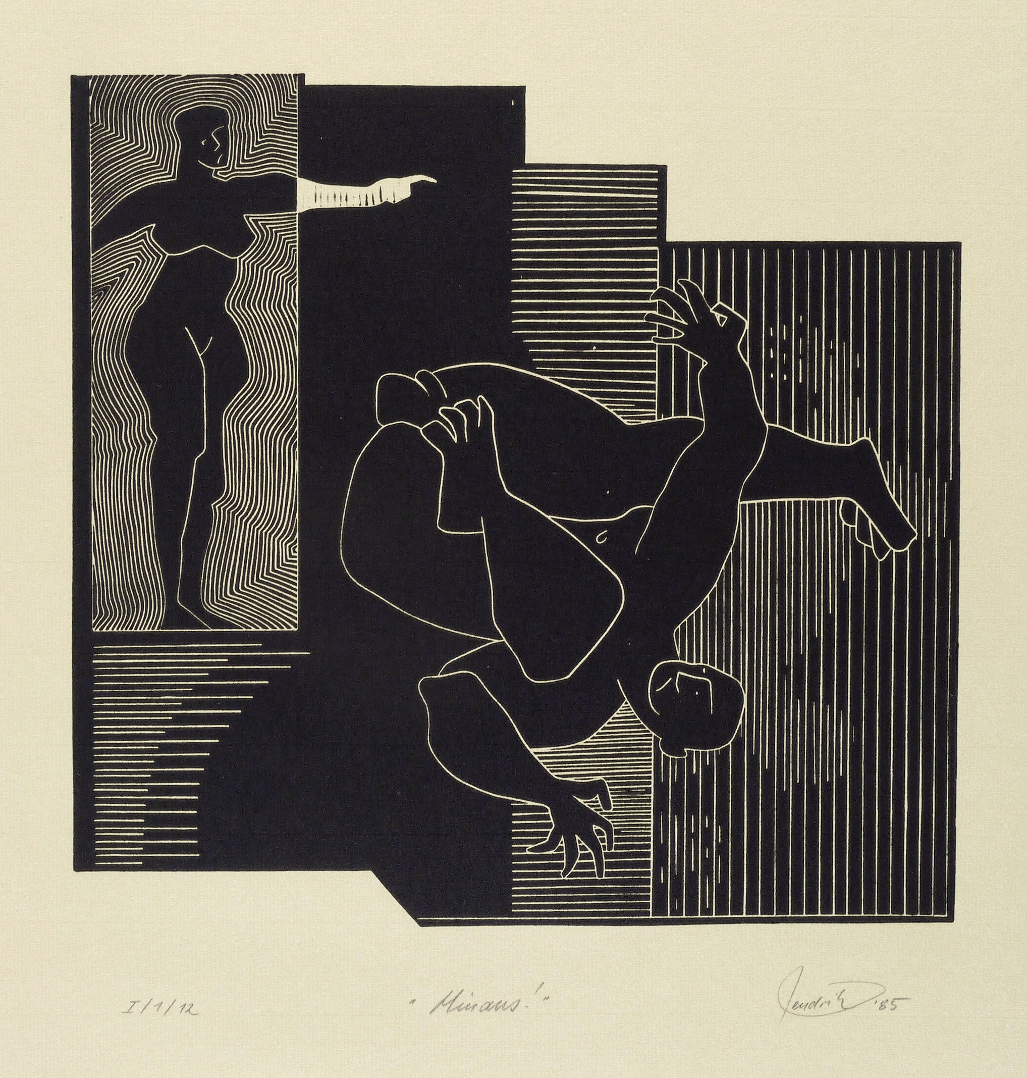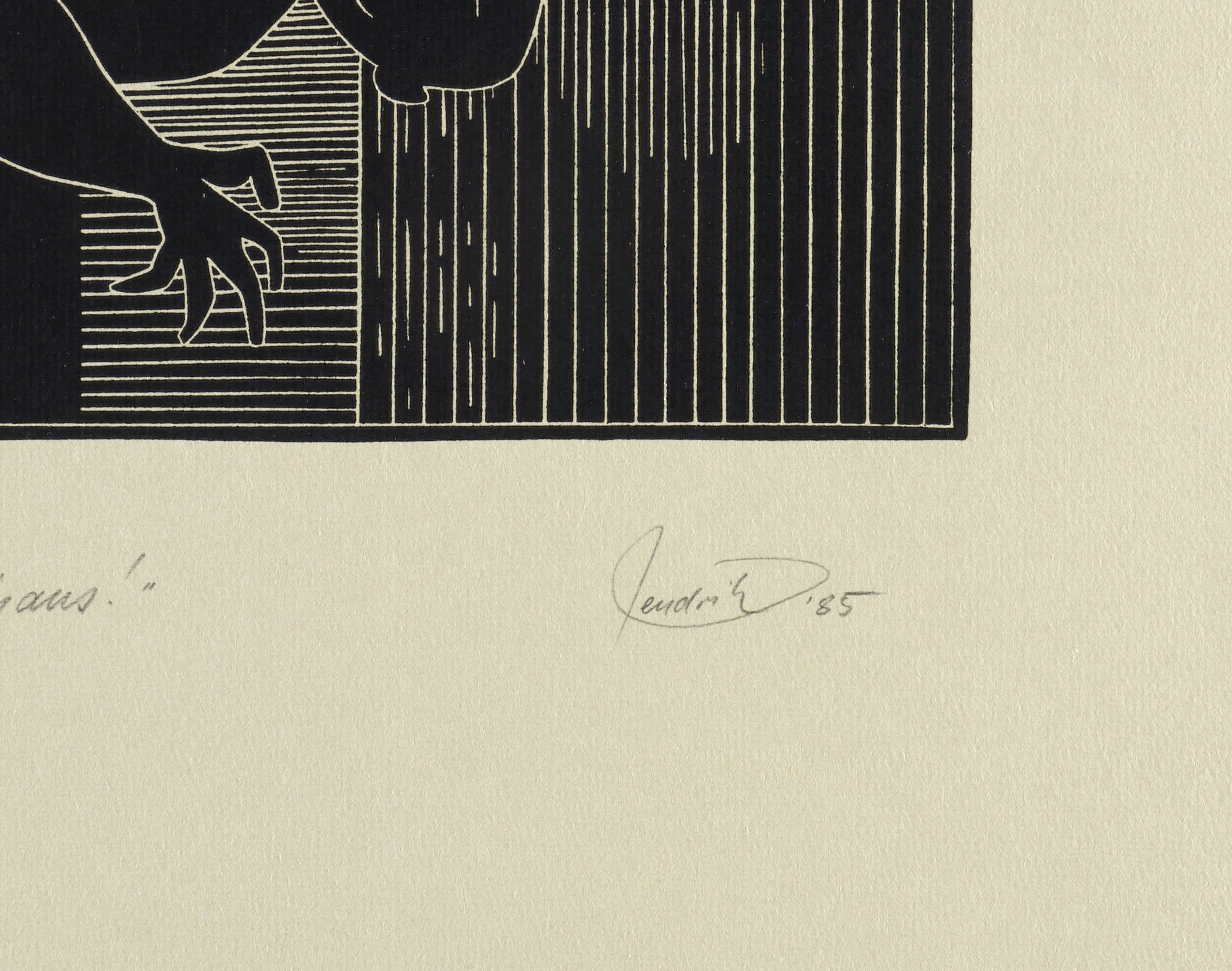 Rechts unten in Bleistift signiert und datiert: ″hendrik 85″. Links Auflagenbezeichnung: ″I/1/12″. Mittig Titel: ″Hinaus!″ Wasserzeichen der Hahnemühle. – Sehr guter Zustand.