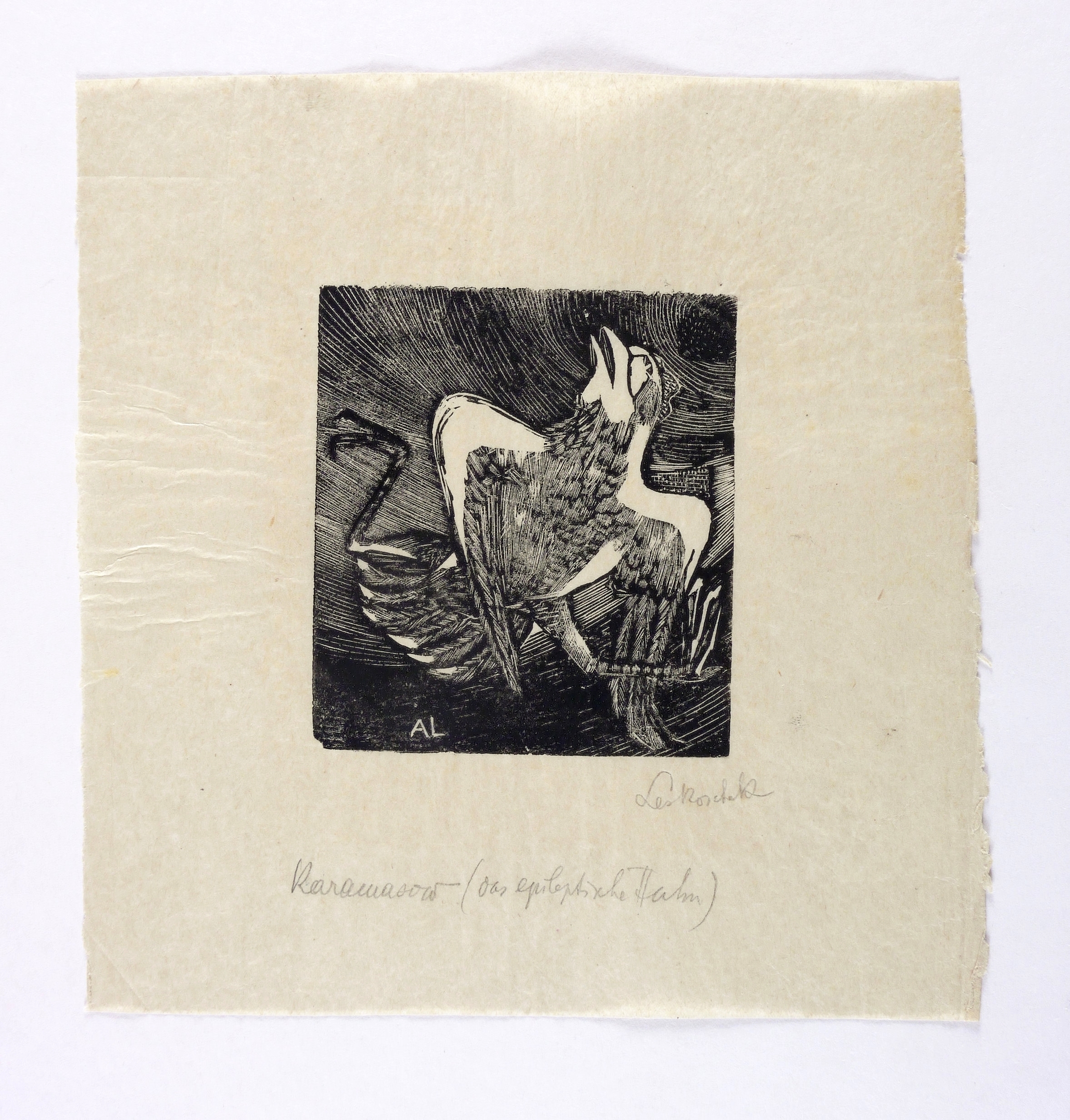 Rechts unten in Bleistift signiert: ″Leskoschek″. Unterhalb weiter bezeichnet: ″Karamasow (das epileptische Huhn)″. – Provenienz: Sammlung Erhard Frommhold, Dresden. Frommhold war langjähriger Lektor, Cheflektor und Verlagsleiter des Verlag der Kunst in Dresden. Hier erschien 1961 das Buch ″Der Illustrator Axl Leskoschek″ (Dresden: Verlag der Kunst 1961) mit einer Einführung von Ina Jun-Broda. – Sehr guter Zustand.