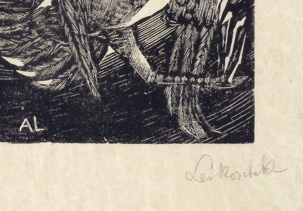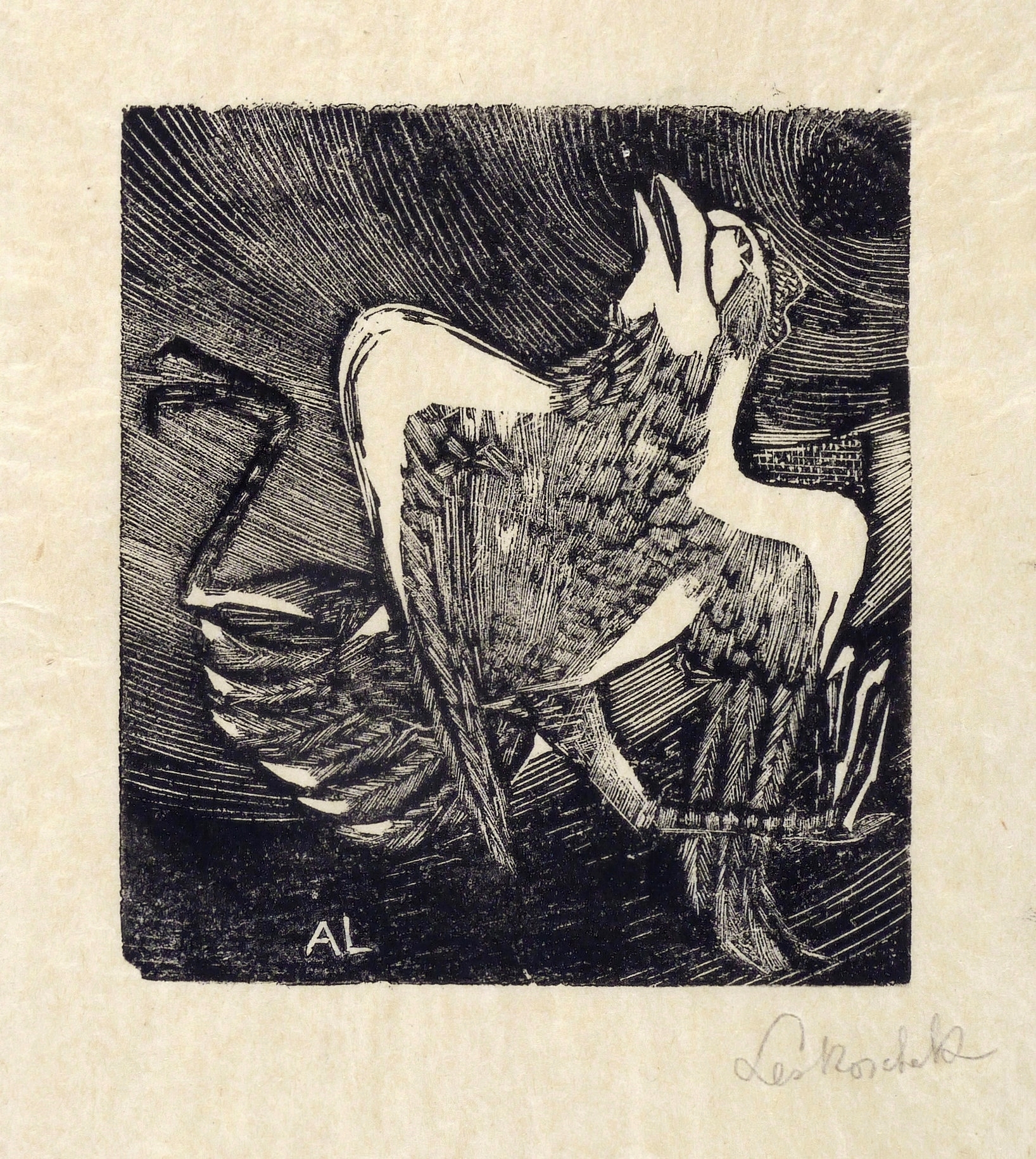 1944. Holzschnitt, in Schwarz, auf feinstem hellchamois Japan. – Originale Künstlergrafik, von Axl Leskoschek. – 10,0 x 9,0 cm (Darstellung / Druckstock), 21 x 19 cm (Blatt).