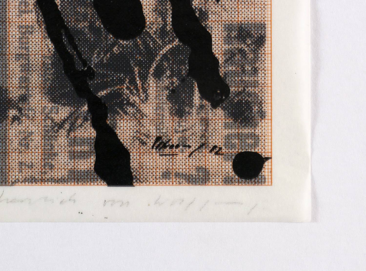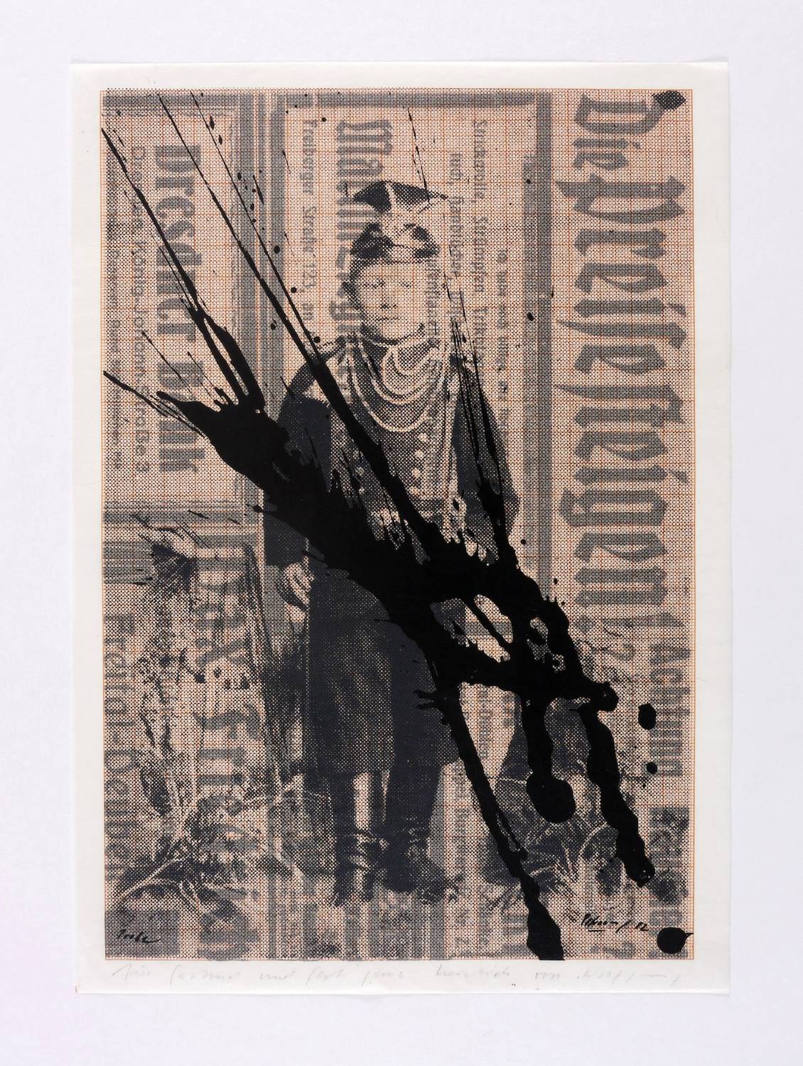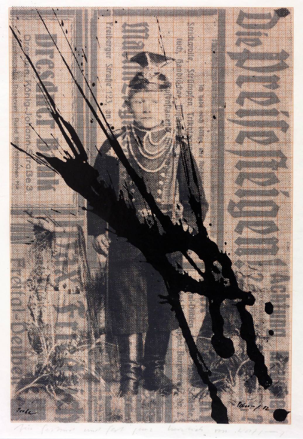 1982. Farbsiebdruck / Farbserigrafie, mit Fotomontage, in 2 Farben, mit Tusche überarbeitet, auf Transparentpapier. – Originale Künstlergrafik, von Wolfgang Petrovsky. – Probedruck. – 30 x 21 cm (Blatt), 28,1 x 19,0 cm (Darstellung / Druckbild).