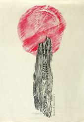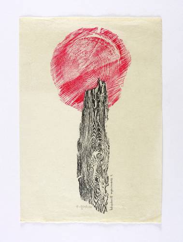 1960-1970. Materialdruck, in Rot & Schwarz, auf leichtem chamois Similijapan. – Originale Künstlergrafik, von Emil Greber. – Unikat. – 27,2 x 11,8 cm (Darstellung / Druckbild), 30 x 21 cm (Blatt).
