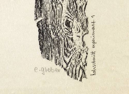 Unterhalb in Bleistift signiert: ″e. greber″. Rechts darüber in Kugelschreiber bezeichnet: ″holzschnitt experimant 1″. – Minimal knickspurig in den Blatträndern. Guter Zustand.