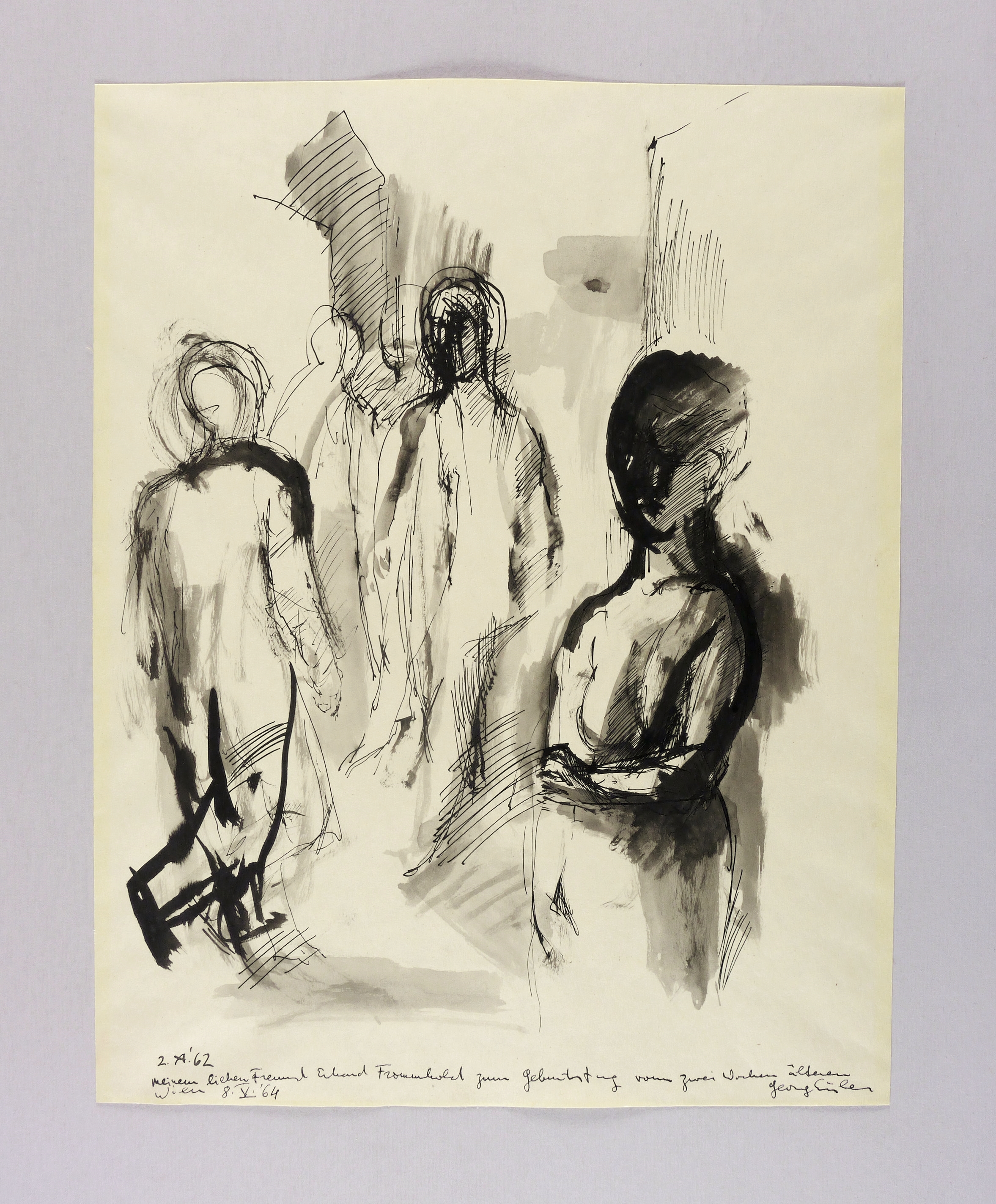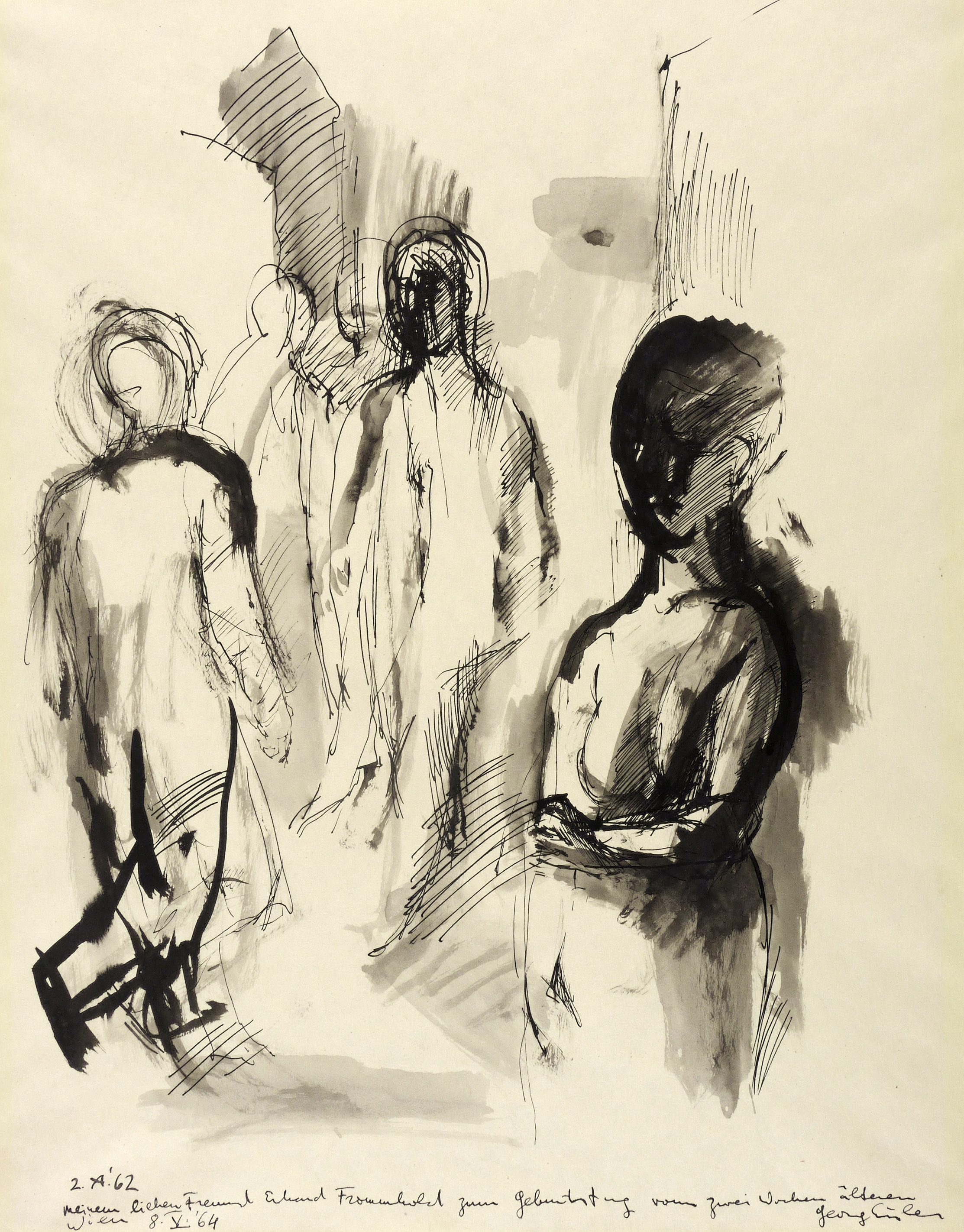 Rechts unten in schwarzer Feder signiert: ″Georg Eisler″. Links datiert: ″2. A. '62″. Dazu Widmung. – Sehr guter Zustand.