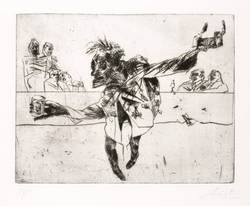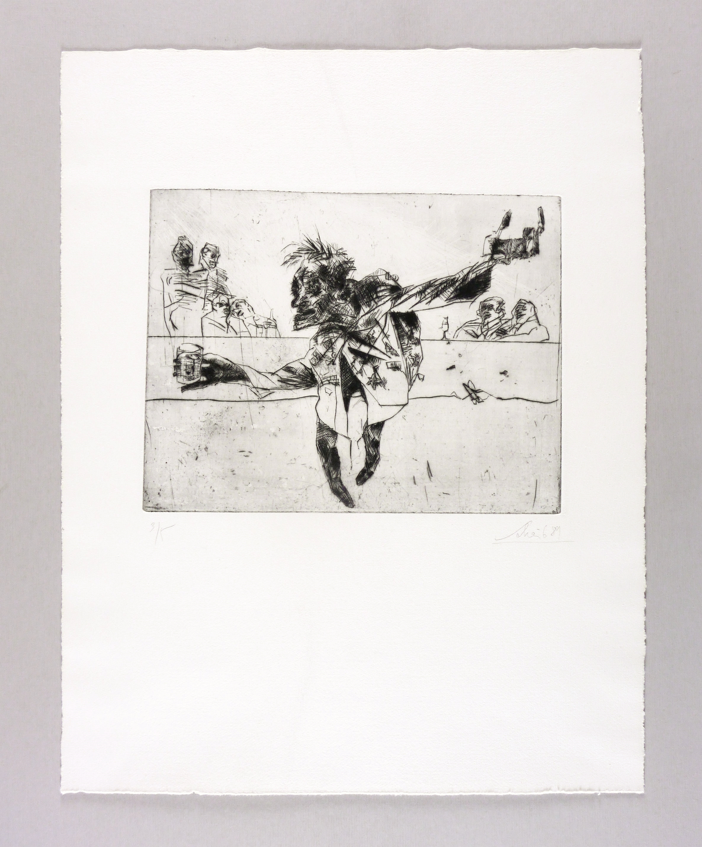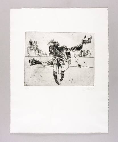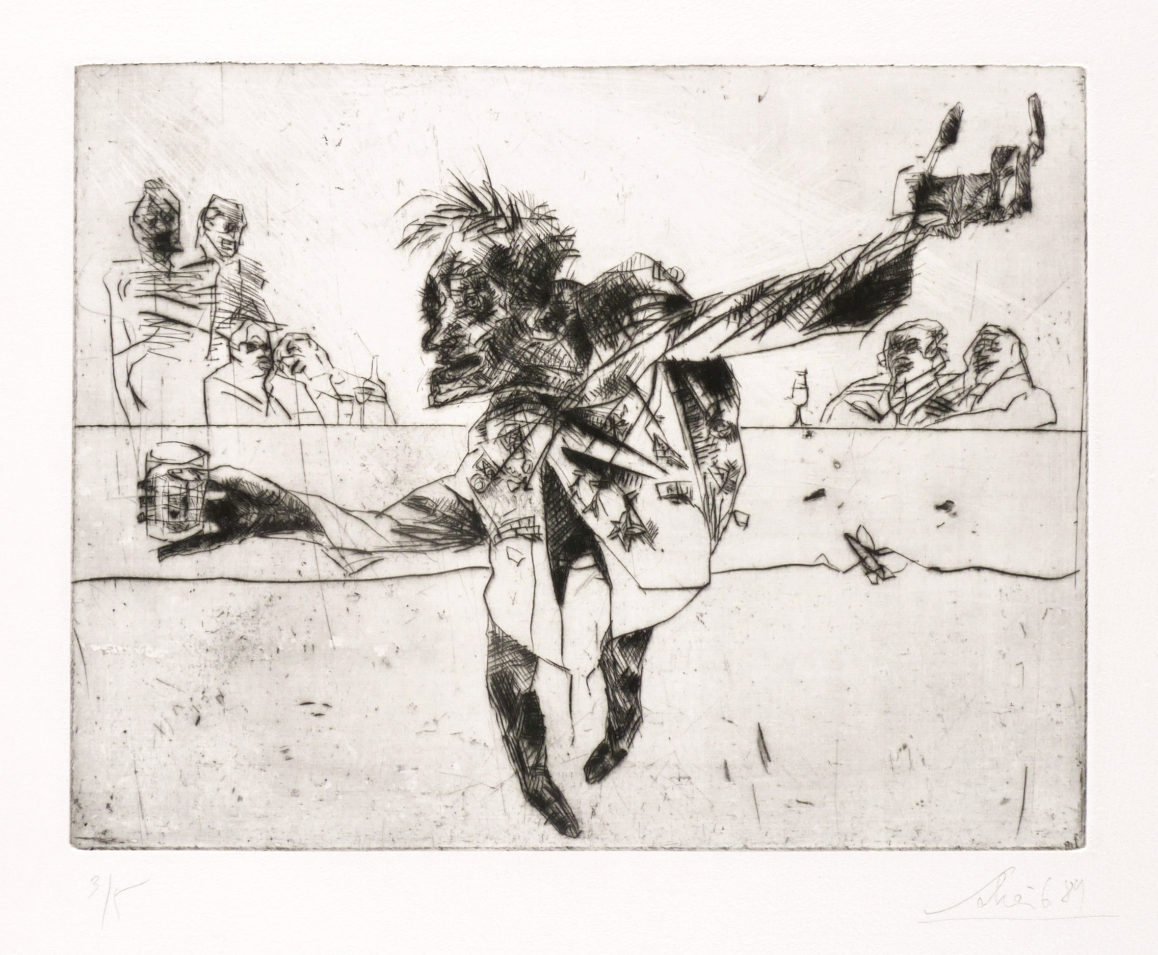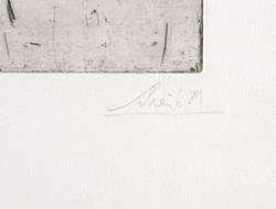 1989. Radierung / Kaltnadel, mit Plattenton, in Schwarz, auf hellchamois Velin. – Originale Künstlergrafik, von Hans Scheib. – Auflage Exemplar Nr. 3/5. – 21,8 x 28,4 cm (Darstellung / Platte), 51 x 40 cm (Blatt).