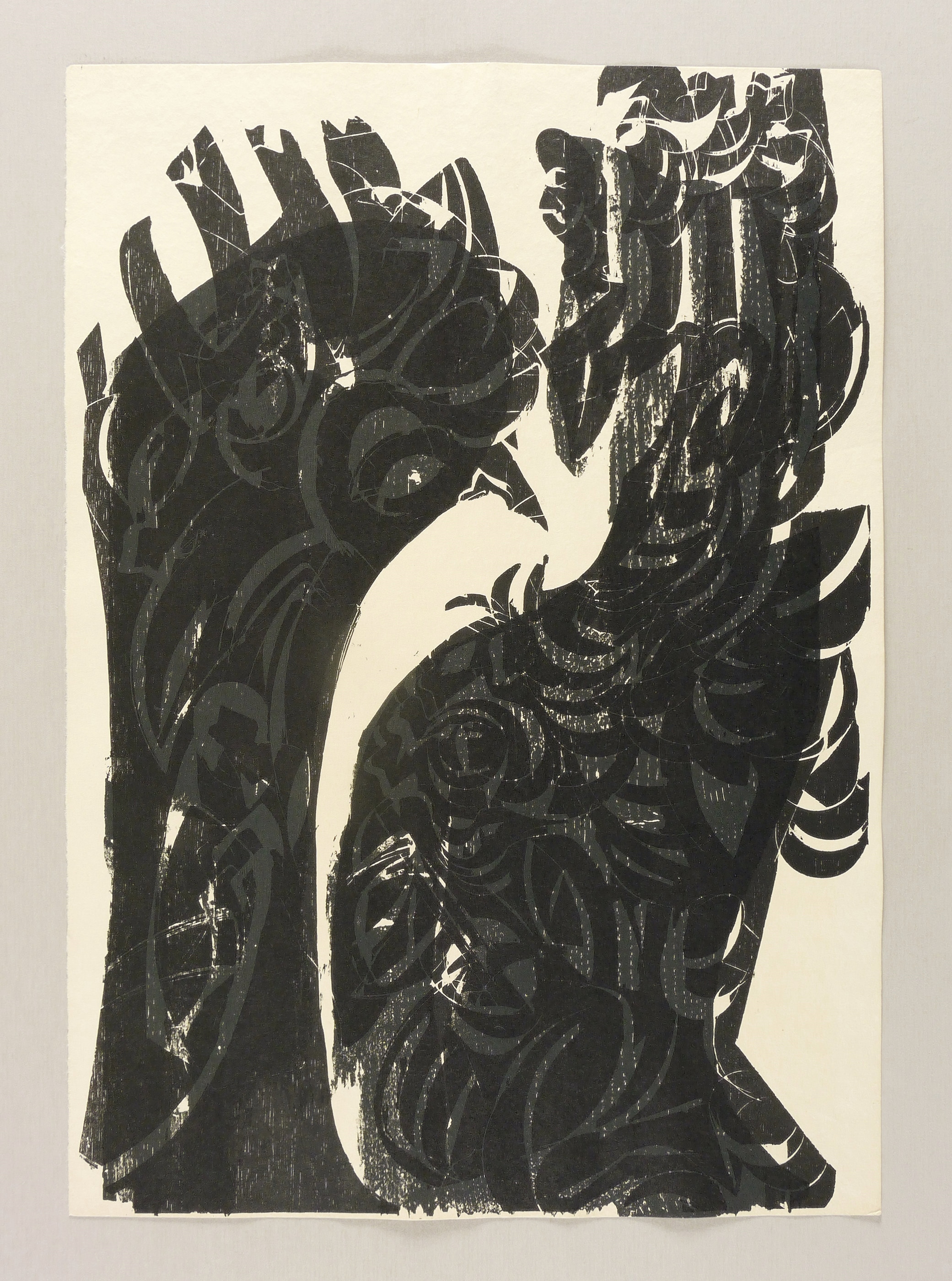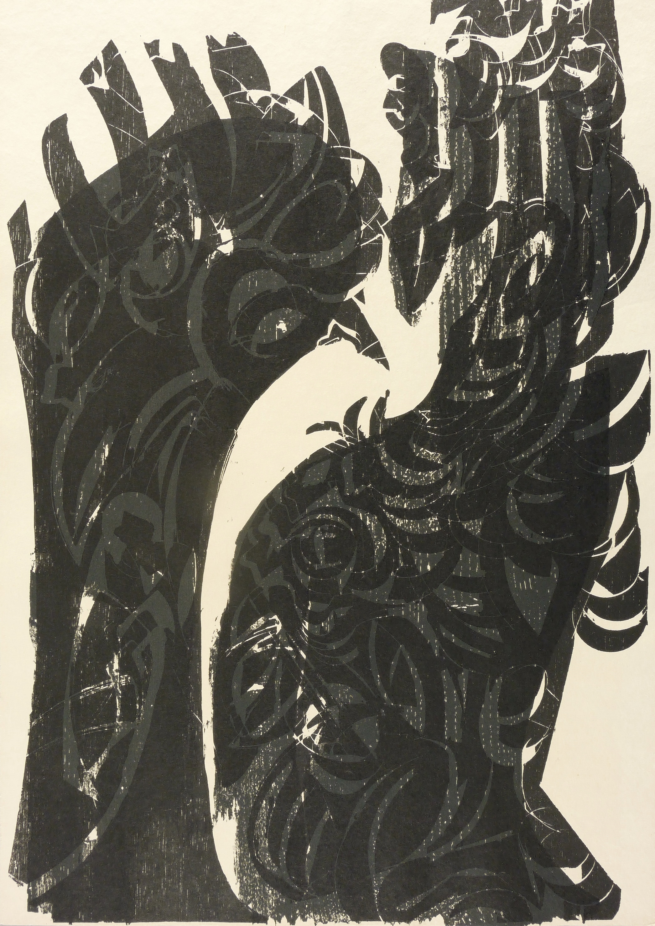1971. Farbholzschnitt, in Anthrazit & Schwarz, auf hellchamois Werkdruck. – Originale Künstlergrafik, von HAP Grieshaber. – Auflage 2000 Exemplare. – 44,0 x 31,2 cm (Darstellung / Blatt).
