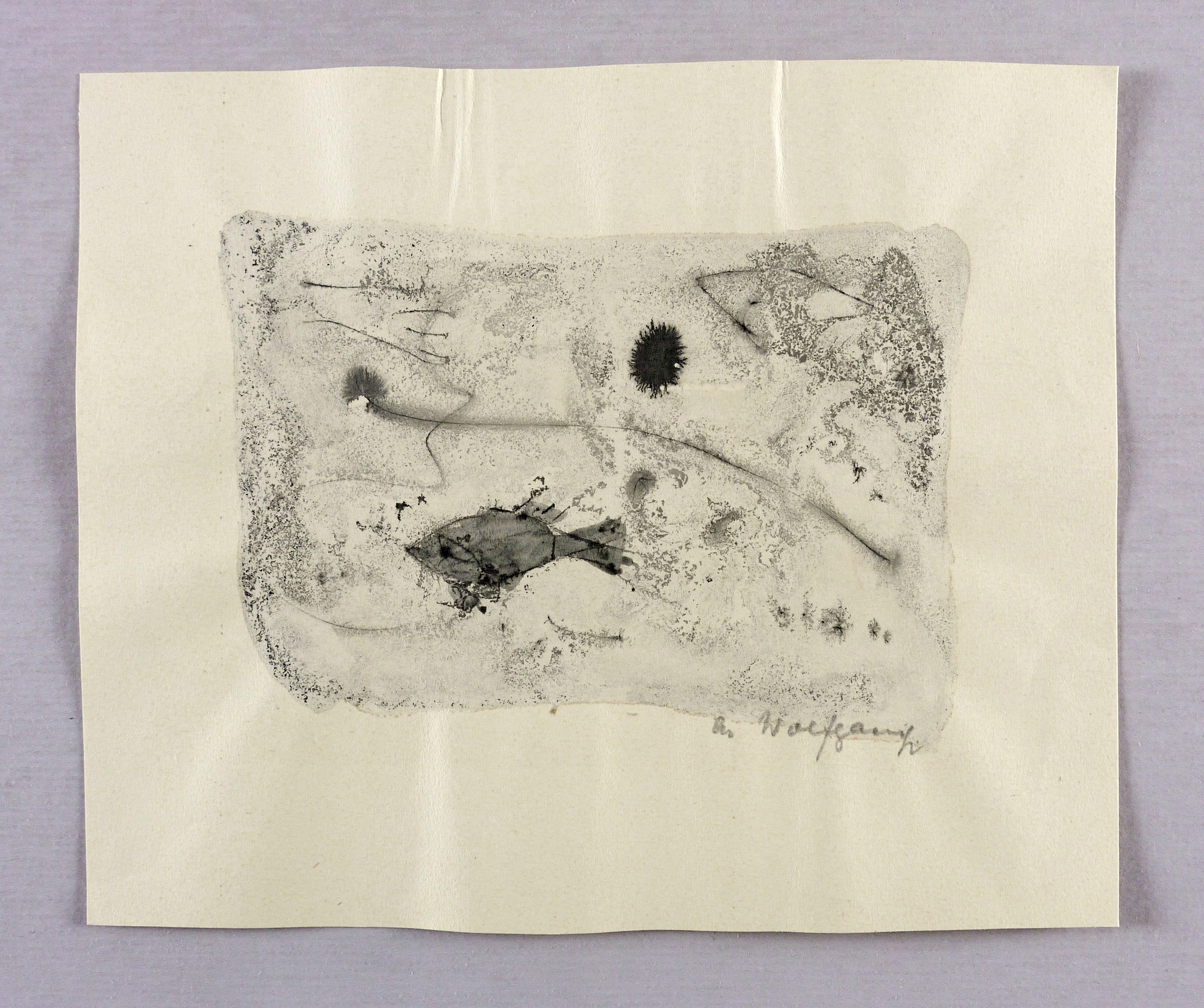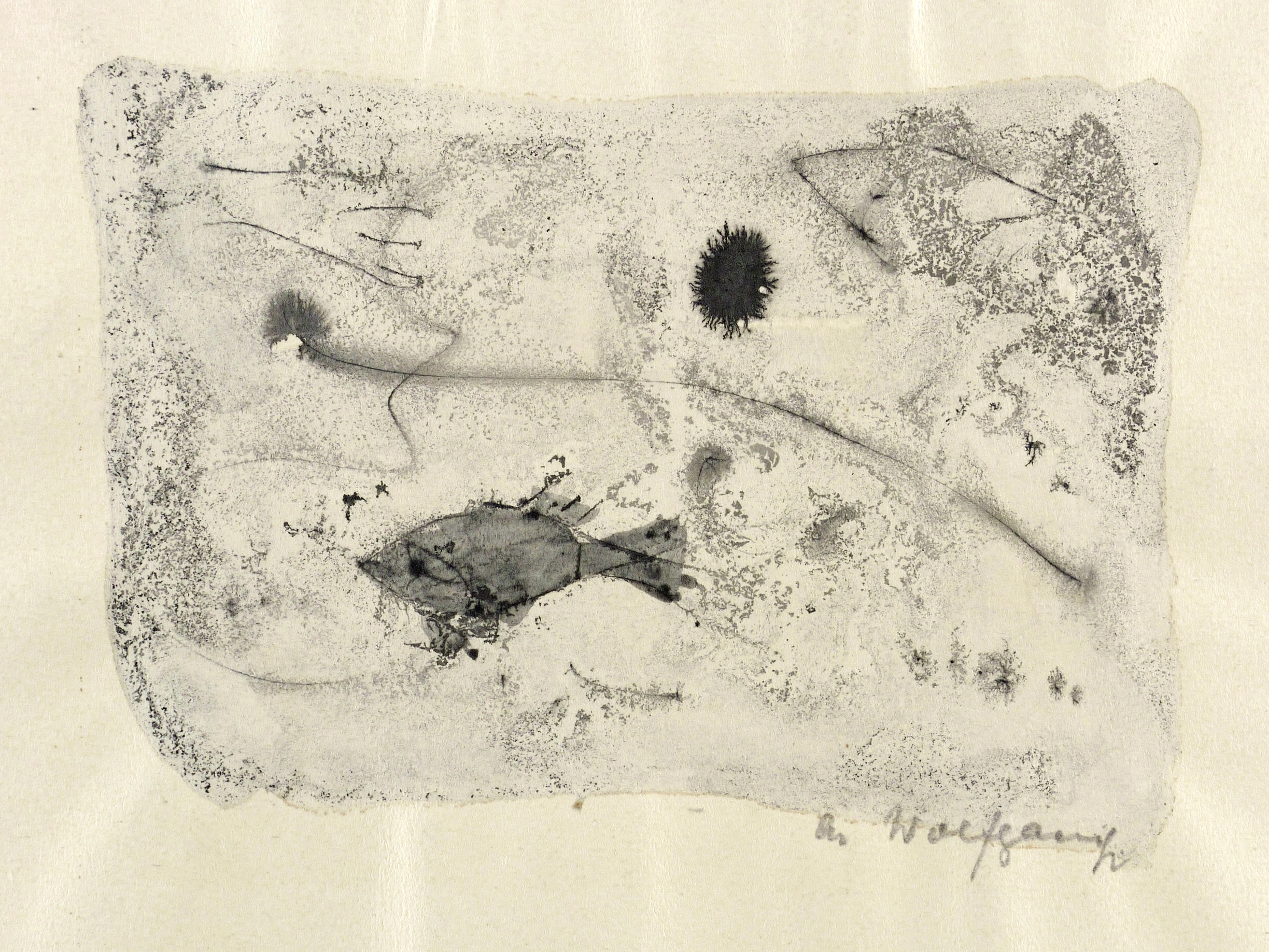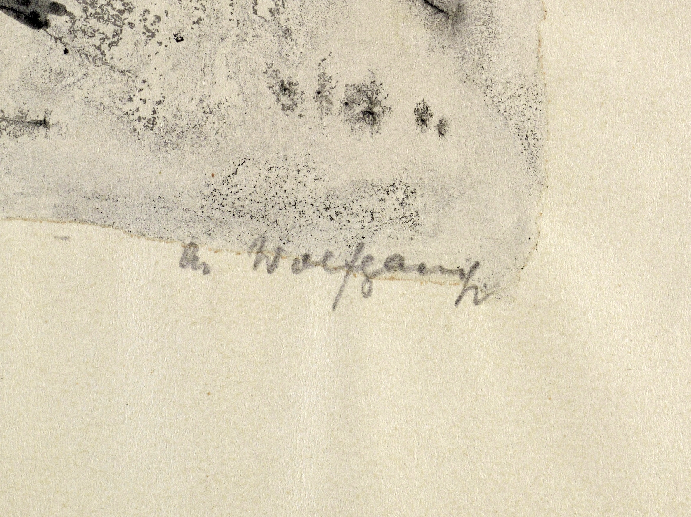 Rechts unten in Bleistift signiert: ″A. Wolfgang″. – Wie ein Aquarell sehr nass gearbeitet, mit häufig zufällig entstandenen Pigment- Verläufen. – Blattränder oben und unten durch den Herstellungsprozess leicht gewellt. Sonst sehr guter Zustand.