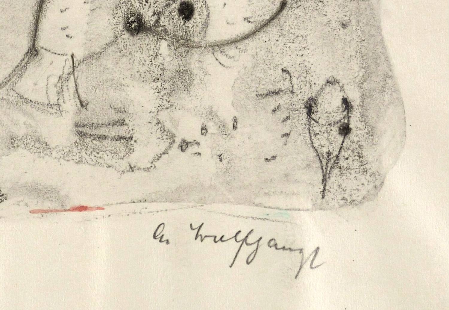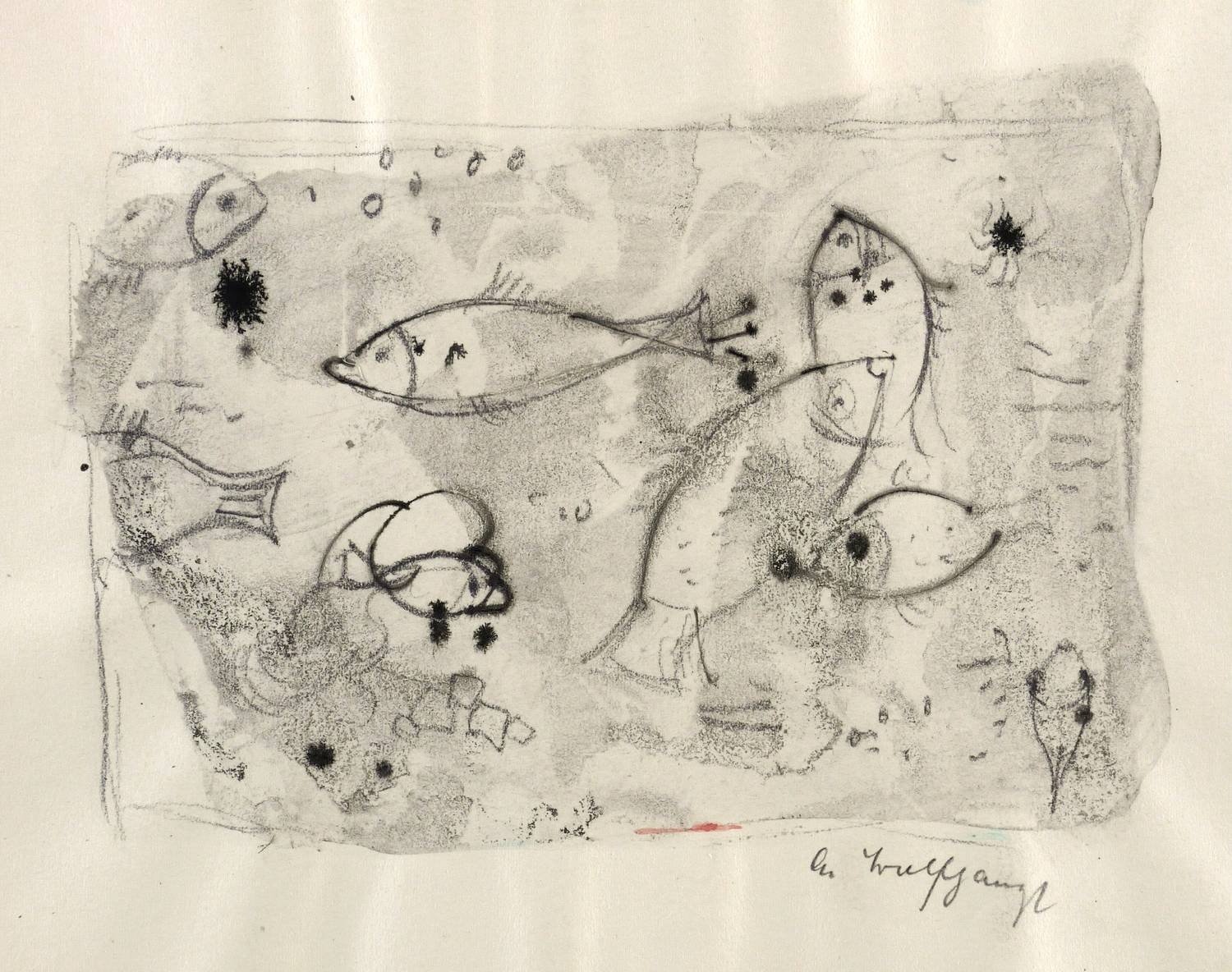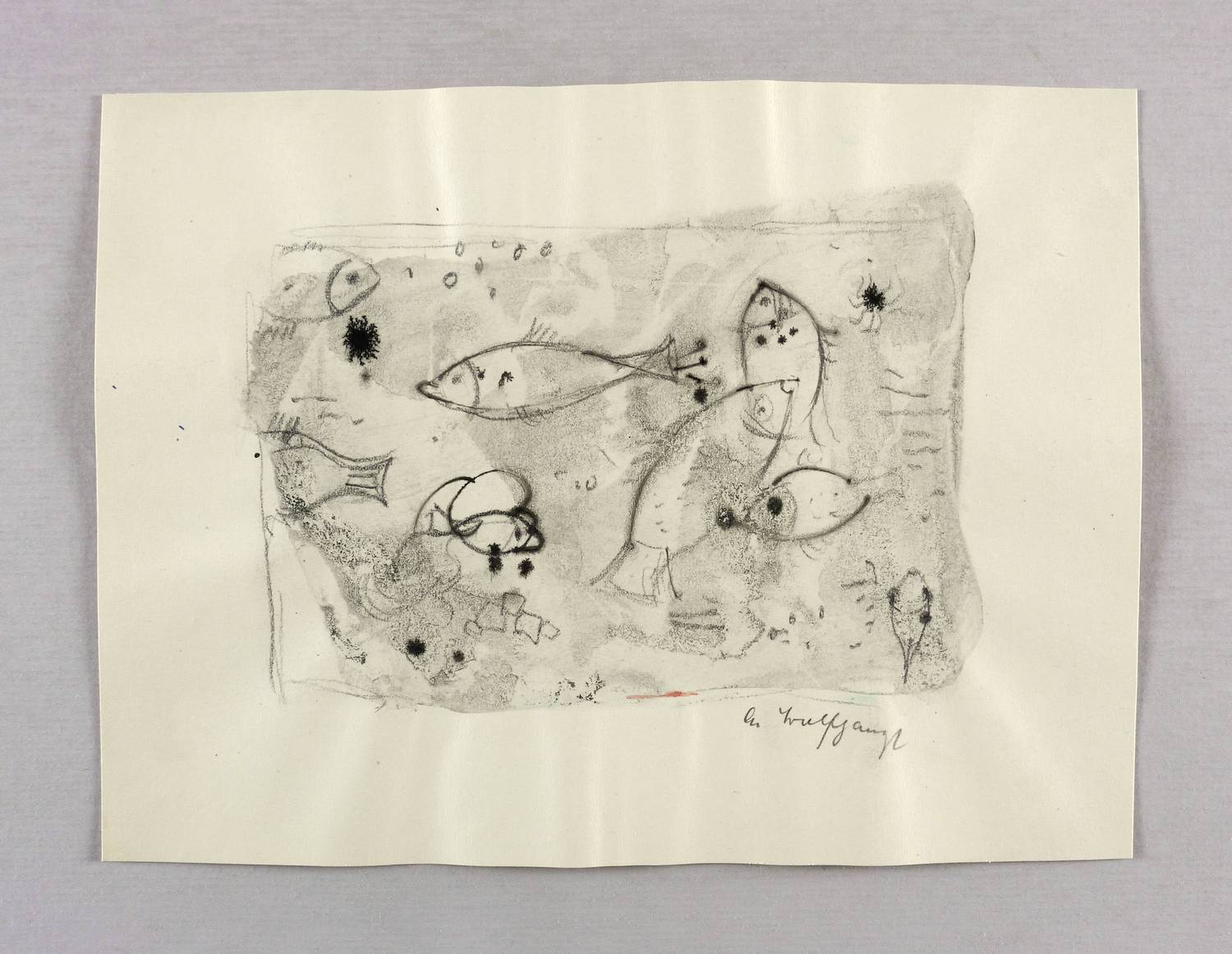 Rechts unten in Bleistift signiert: ″A. Wolfgang″. – Wie ein Aquarell sehr nass gearbeitet, mit häufig zufällig entstandenen Pigment- Verläufen. – Blattränder oben und unten durch den Herstellungsprozess leicht gewellt. Sonst sehr guter Zustand.