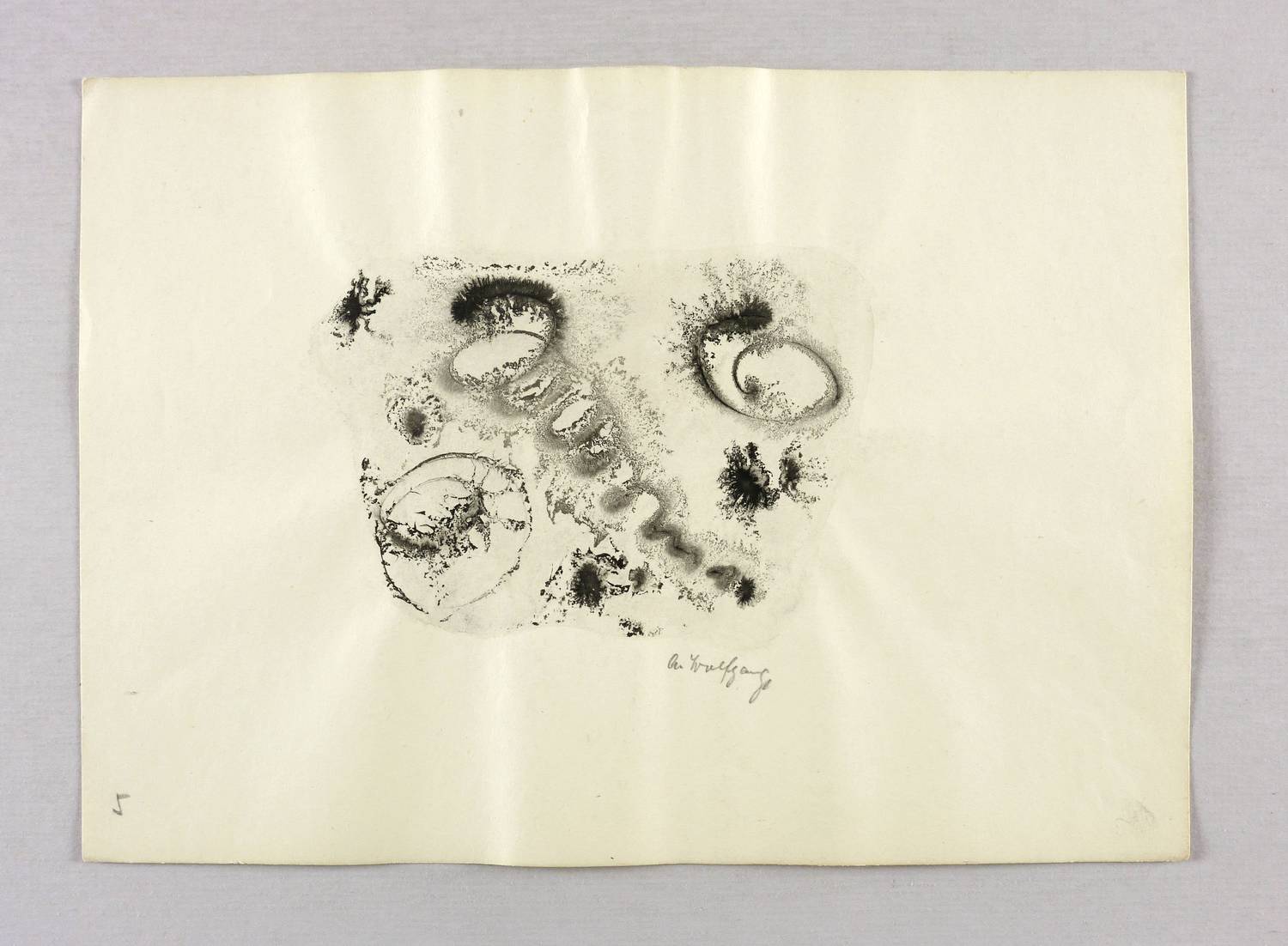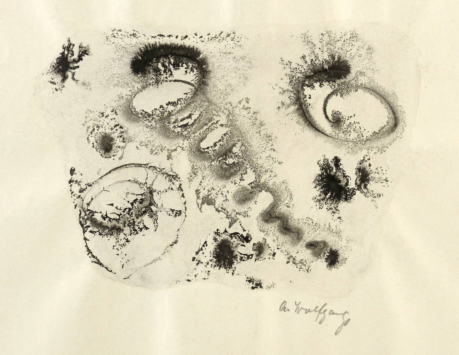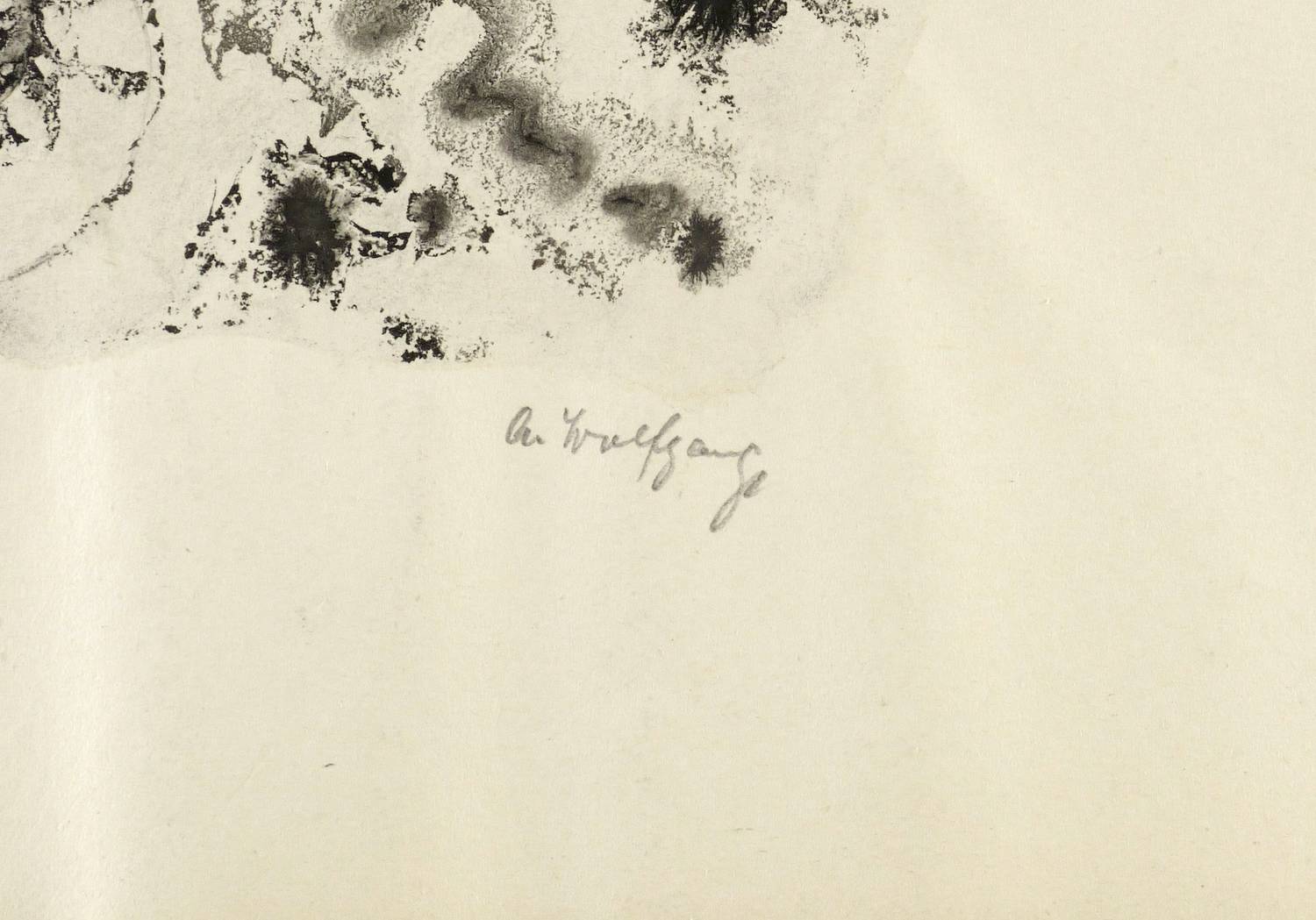 Rechts unten in Bleistift signiert: ″A. Wolfgang″. – Wie ein Aquarell sehr nass gearbeitet, mit häufig zufällig entstandenen Pigment- Verläufen. – Blattränder oben und unten durch den Herstellungsprozess leicht gewellt. Sonst sehr guter Zustand.