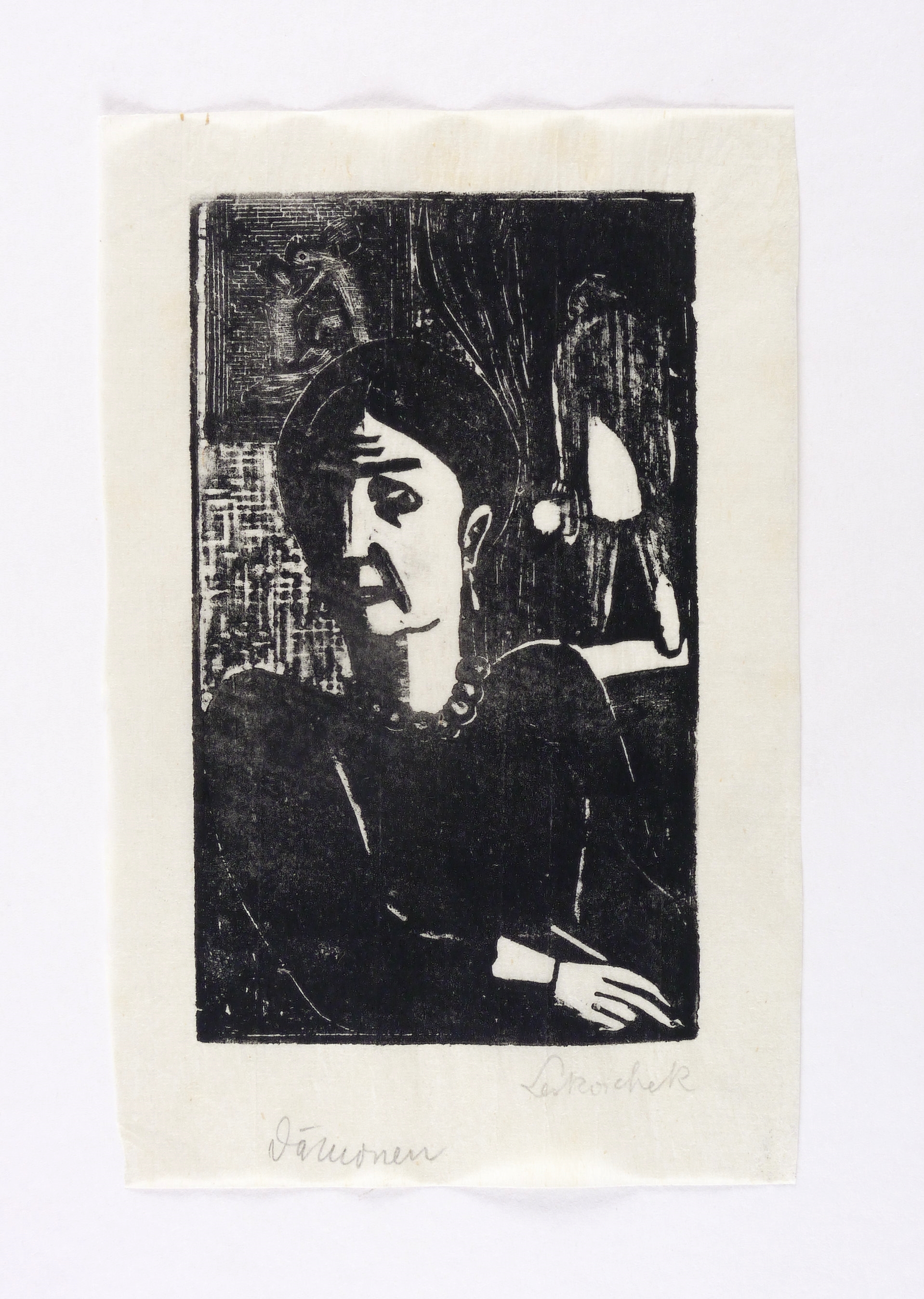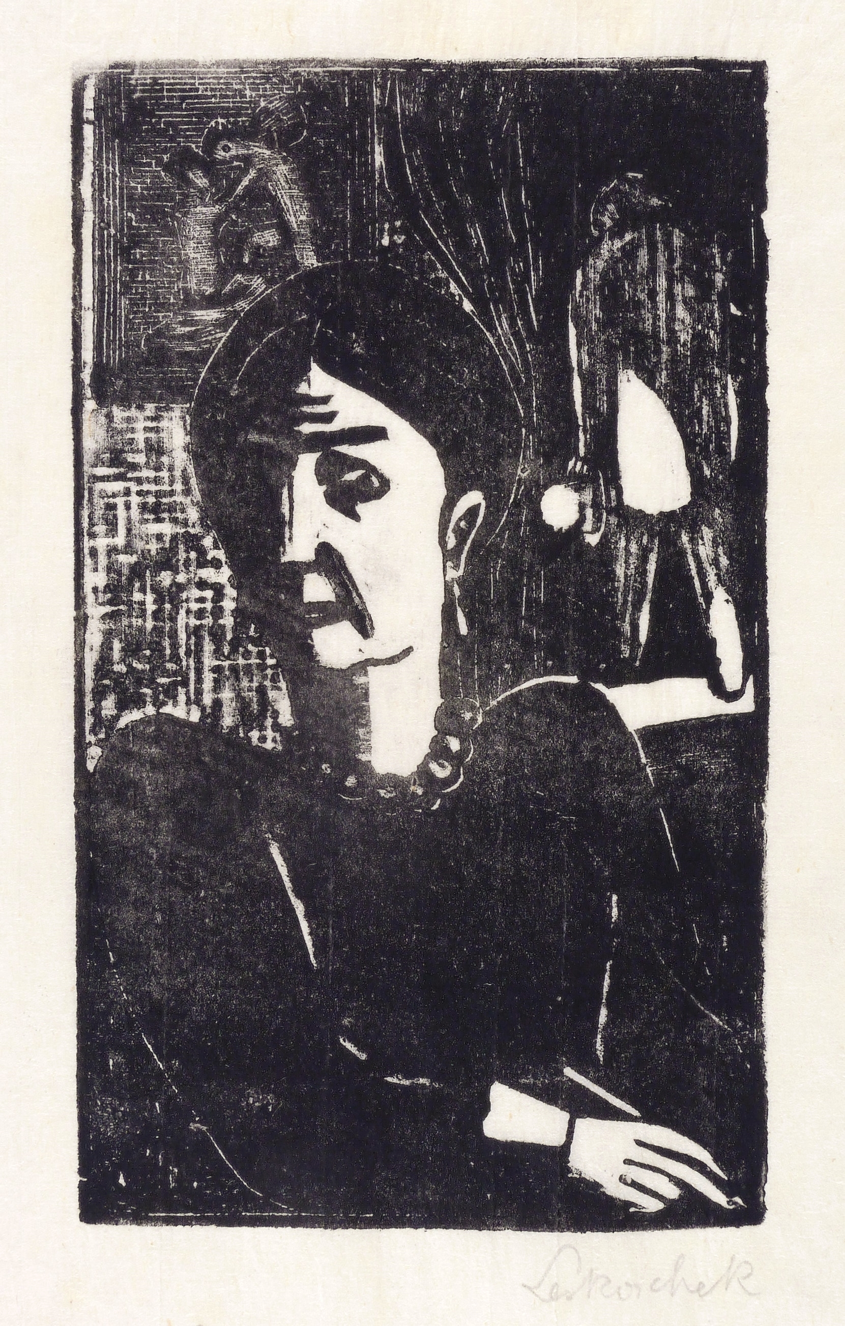 1941-1948. Holzschnitt, in Schwarz, auf feinstem chamois Japan. – Originale Künstlergrafik, von Axl Leskoschek. – 16,5 x 9,7 cm (Darstellung / Druckstock), 21 x 14 cm (Blatt).