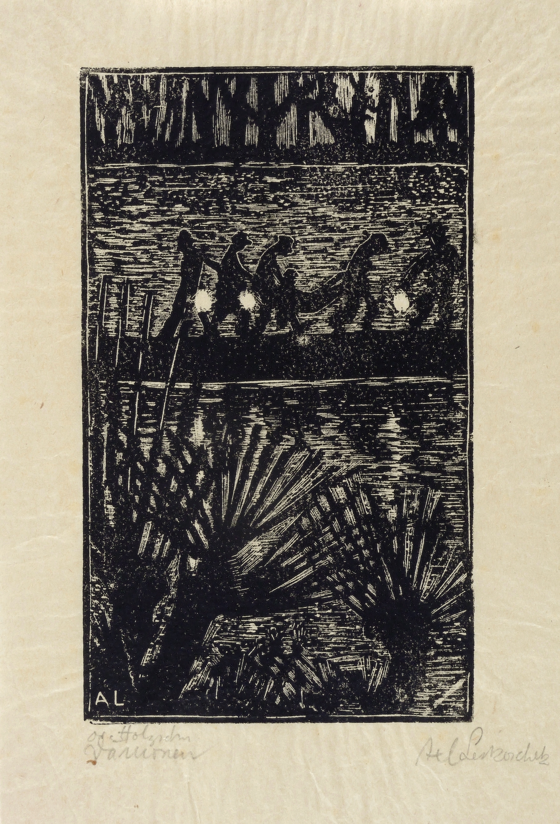 1941-1948. Holzschnitt, in Schwarz, auf feinstem chamois Japan. – Originale Künstlergrafik, von Axl Leskoschek. – 16,3 x 9,7 cm (Darstellung / Druckstock), 23 x 16 cm (Blatt).