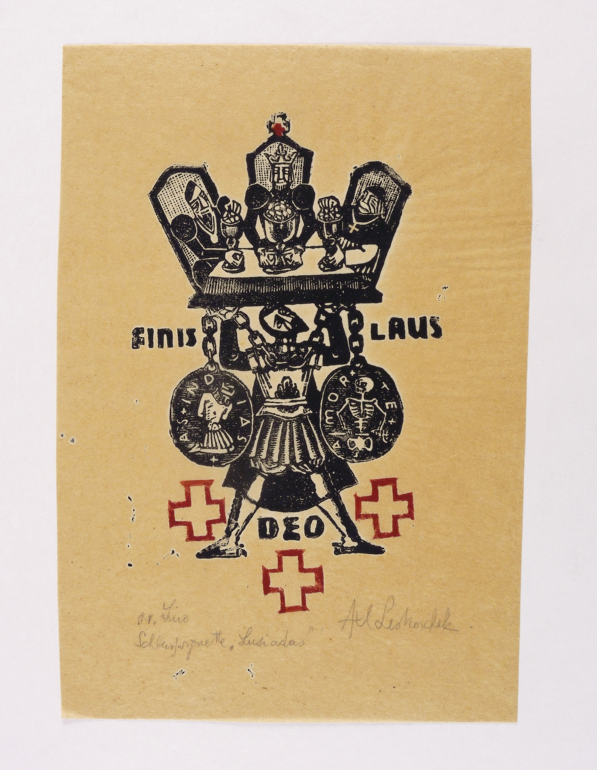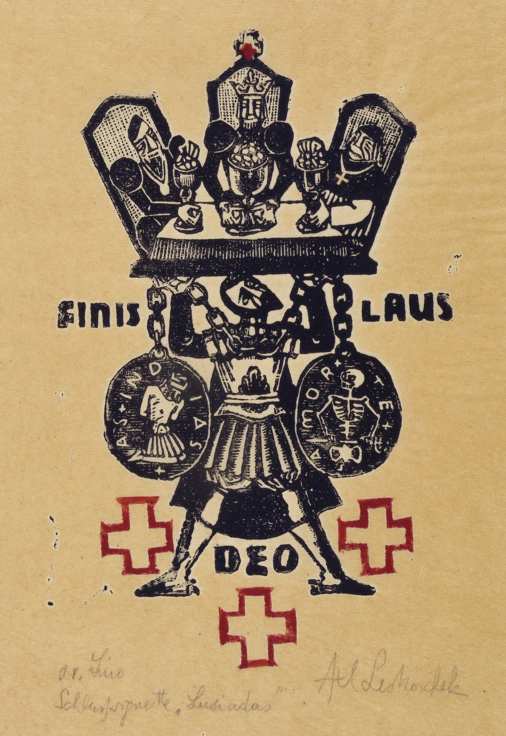 Rechts unten in Bleistift signiert: ″Axl Leskoschek″. Dazu links bezeichnet: ″Or. Lino // Schlußvignette Lusiadas″. Im Druckstock Inschrift: ″FINIS / LAUS / DEO // 1942″. – Provenienz: Sammlung Erhard Frommhold, Dresden. Frommhold war langjähriger Lektor, Cheflektor und Verlagsleiter des Verlag der Kunst in Dresden. Hier erschien 1961 das Buch ″Der Illustrator Axl Leskoschek″ (Dresden: Verlag der Kunst 1961) mit einer Einführung von Ina Jun-Broda. – Sehr guter Zustand.