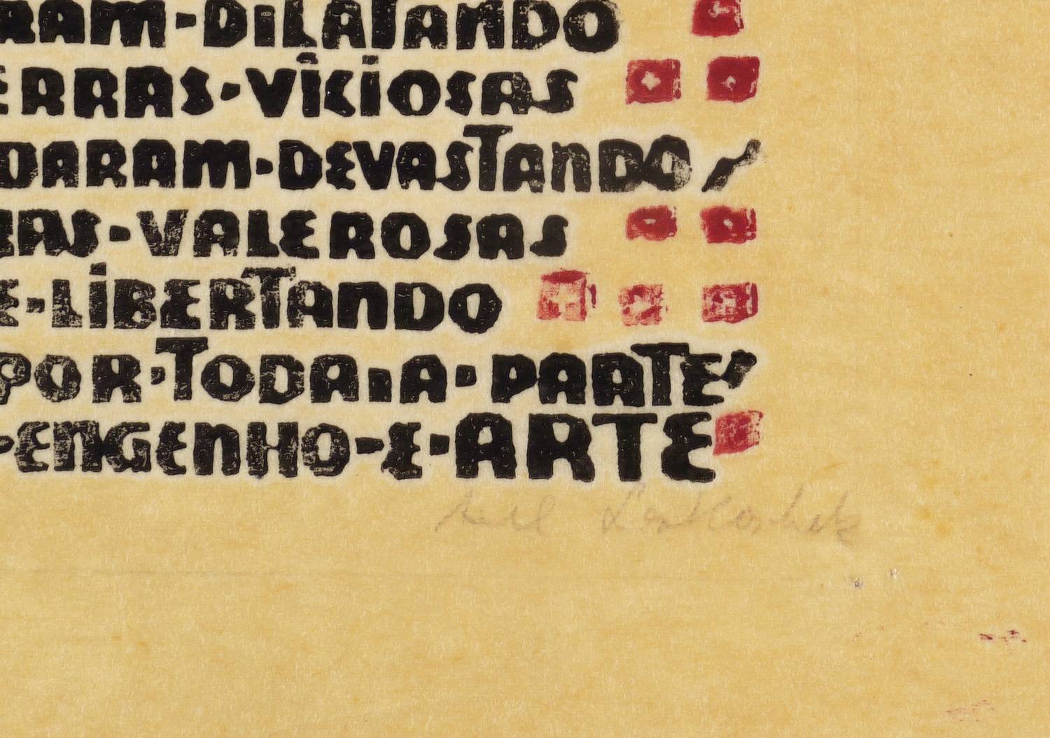 Rechts unten in Bleistift signiert: ″Axl Leskoschek″. Dazu links bezeichnet: ″Lusiadas″. Im Druckstock Inschrift: ″AS ARMAS / (...)″. – Provenienz: Sammlung Erhard Frommhold, Dresden. Frommhold war langjähriger Lektor, Cheflektor und Verlagsleiter des Verlag der Kunst in Dresden. Hier erschien 1961 das Buch ″Der Illustrator Axl Leskoschek″ (Dresden: Verlag der Kunst 1961) mit einer Einführung von Ina Jun-Broda. – Sehr guter Zustand.