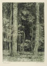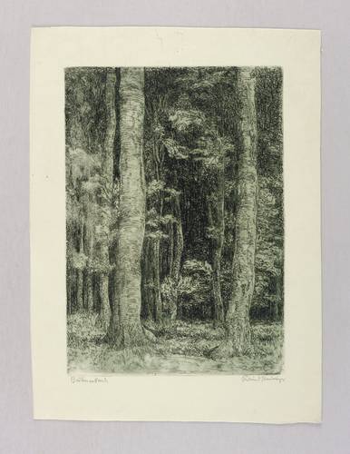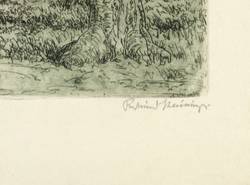 Rechts unten in Bleistift signiert: ″Ferdinand Steiniger″. Links betitelt: ″Buchenwaldrand″. In der Platte links unten Monogramm und Jahr: ″FSt 1920″. – Sehr guter Zustand.