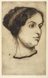 Rechts unten in Bleistift signiert: ″Ferdinand Steiniger.″ Links bezeichnet: ″Damenporträt (Kaltnadel)″. In der Platte links Monogramm und Jahr: ″FST 1910″. – Sehr guter Zustand.