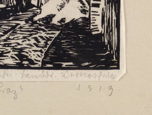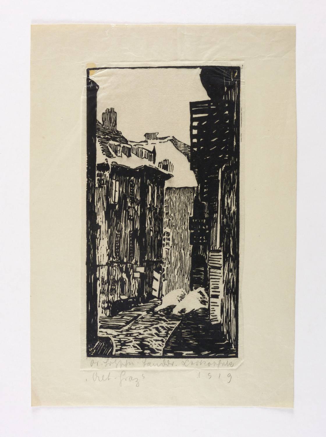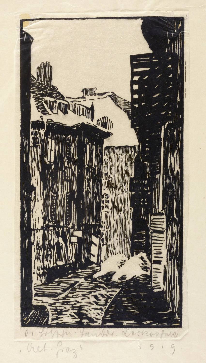 Rechts unten in Bleistift signiert: ″Leskoschek″. Links unten bezeichnet: ″Or. Holzschn. Handdr.″ Auf dem Trägerblatt links unten Titel: ″Alt-Graz″. – Provenienz: Sammlung Erhard Frommhold, Dresden. Frommhold war langjähriger Lektor, Cheflektor und Verlagsleiter des Verlag der Kunst in Dresden. Hier erschien 1961 das Buch ″Der Illustrator Axl Leskoschek″ (Dresden: Verlag der Kunst 1961) mit einer Einführung von Ina Jun-Broda. – Sehr guter Zustand.
