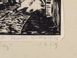 1919. Holzschnitt, in Schwarz, auf leichtem hellgelbem Japan. – Originale Künstlergrafik, von Axl Leskoschek. – 22,3 x 11,7 cm (Darstellung / Druckstock), 23,5 x 12,5 cm (Blatt), 30 x 21 cm (Trägerblatt).