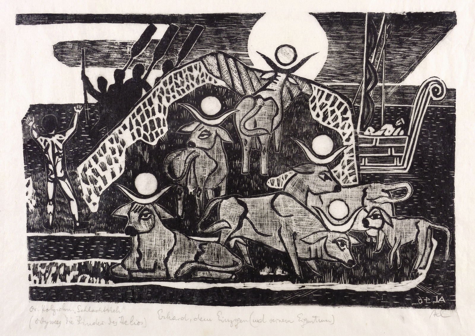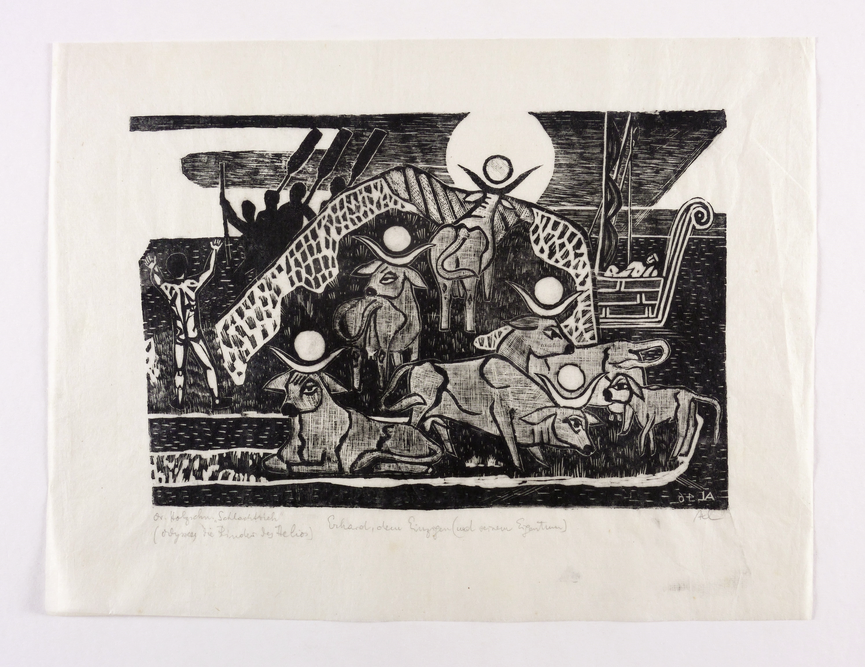 Rechts unten in Bleistift signiert: ″Axl″. Links unten bezeichnet: ″Or. Holzschn. 'Schlachtvieh' (Odyssee die Rinder des Helios)″. Mittig Widmung. – Provenienz: Sammlung Erhard Frommhold, Dresden. Frommhold war langjähriger Lektor, Cheflektor und Verlagsleiter des Verlag der Kunst in Dresden. Hier erschien 1961 das Buch ″Der Illustrator Axl Leskoschek″ (Dresden: Verlag der Kunst 1961) mit einer Einführung von Ina Jun-Broda. – Sehr guter Zustand.