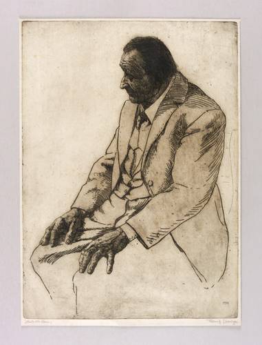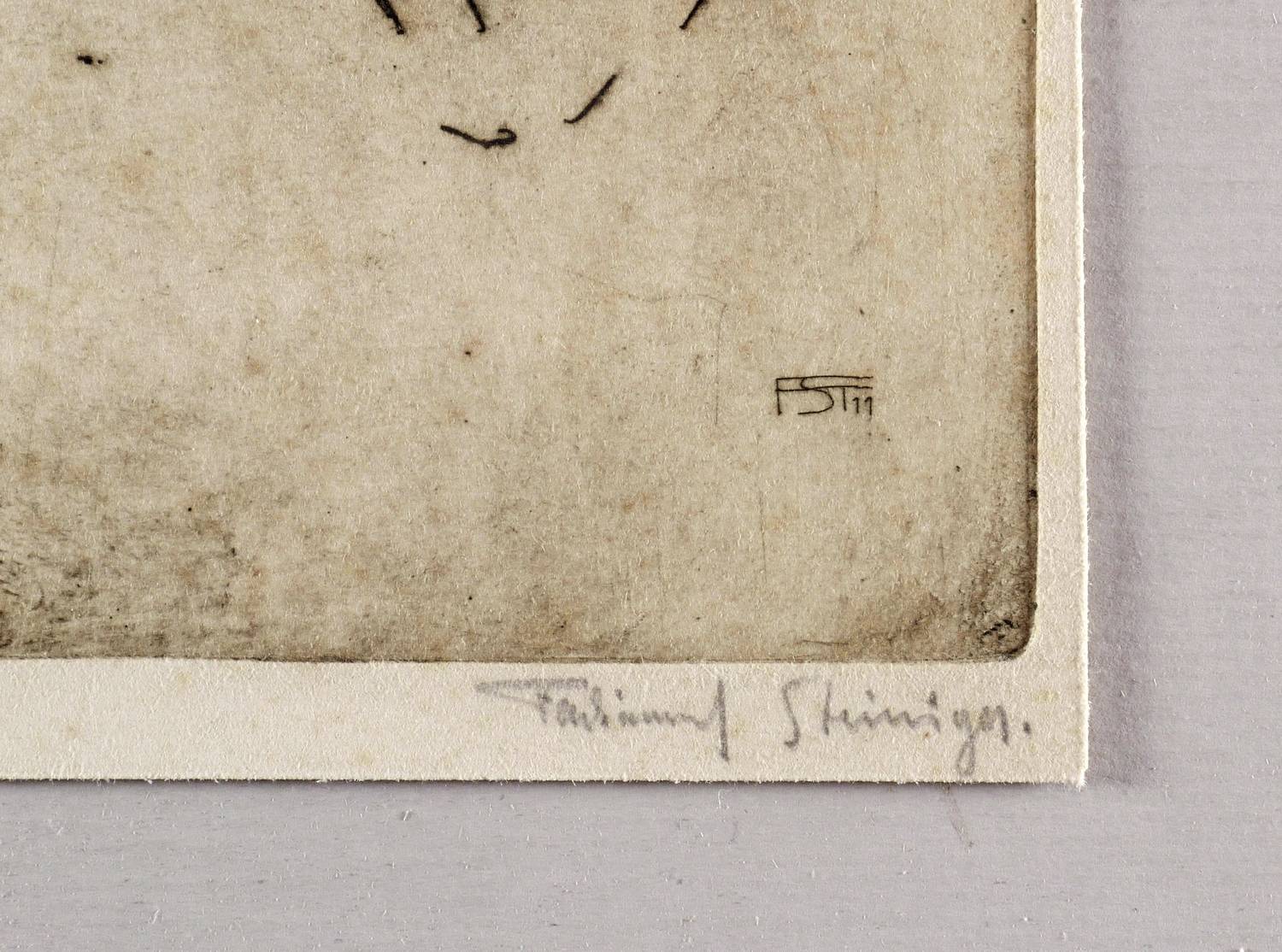 Rechts unten in Bleistift signiert: ″Ferdinand Steiniger.″ Links bezeichnet: ″Sitzender alter Mann″. In der Platte rechts unten Monogramm und Jahr: ″FST 11″. – Sehr guter Zustand.