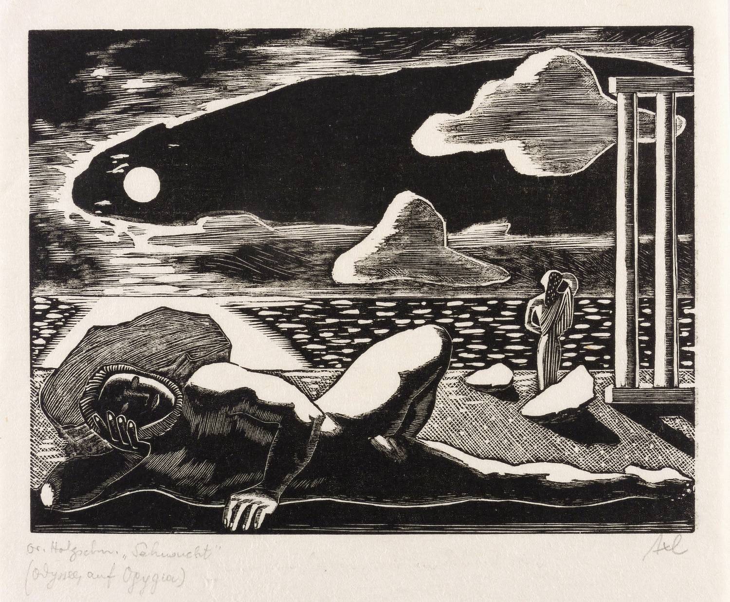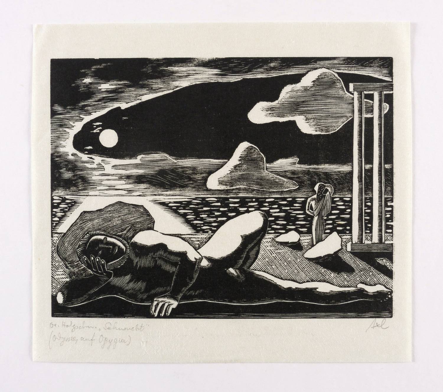 Rechts unten in Bleistift signiert: ″Axl″. Links unten bezeichnet: ″Or. Holzschn. 'Sehnsucht' (Odyssee, auf Ogygia)″. – Provenienz: Sammlung Erhard Frommhold, Dresden. Frommhold war langjähriger Lektor, Cheflektor und Verlagsleiter des Verlag der Kunst in Dresden. Hier erschien 1961 das Buch ″Der Illustrator Axl Leskoschek″ (Dresden: Verlag der Kunst 1961) mit einer Einführung von Ina Jun-Broda. – Sehr guter Zustand.