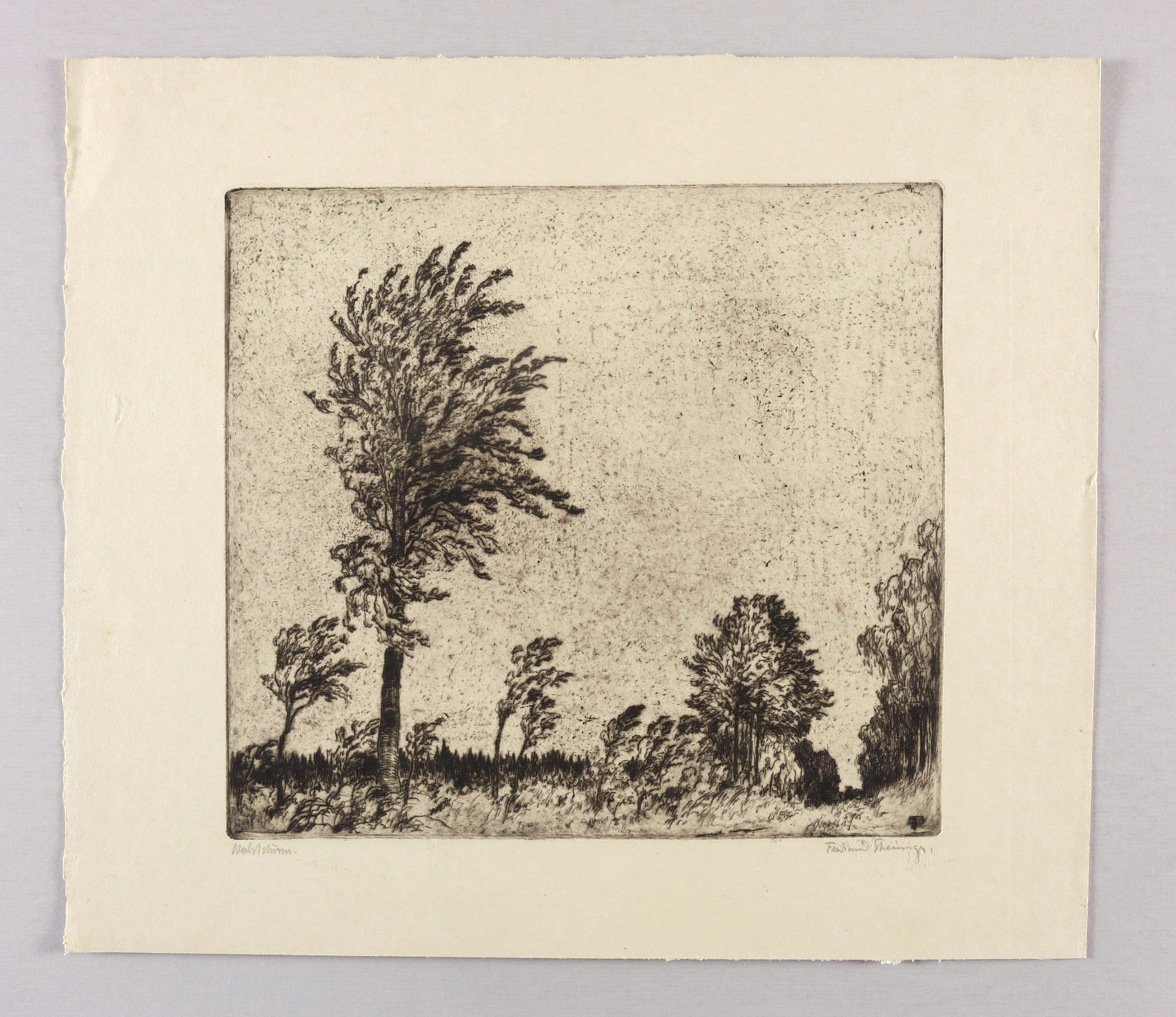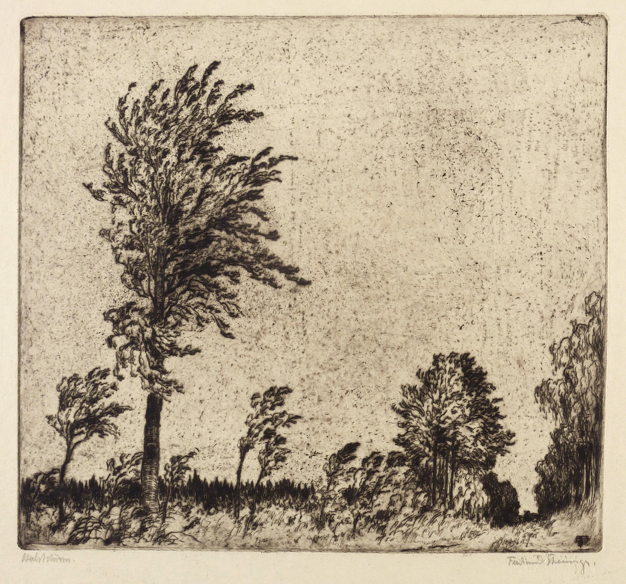 Rechts unten in Bleistift signiert: ″Ferdinand Steiniger.″ Links Titel: ″Herbststurm.″ In der Platte links unten Monogramm und Jahr: ″FST 37″. – Sehr guter Zustand.