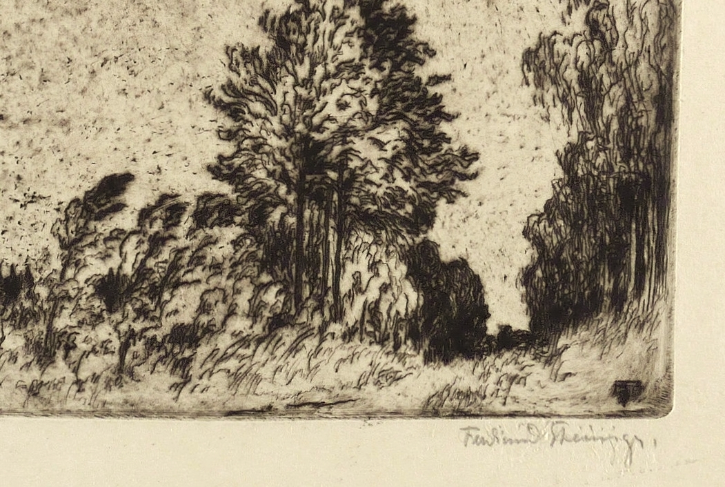 Ferdinand Steiniger (1882 Leipzig - 1959 Dresden-Loschwitz). Oft auch falsch Ferdinand Steininger. Deutscher Maler, Buchkünstler und Grafiker. Schüler von Richard Müller, Oskar Zwintscher und Eugen Bracht an der Dresdener Kunstgewerbeschule und später an der Kunstakademie Dresden. War in Dresden-Loschwitz ansässig. 1938 Sonderausstellung im Badischen Kunstverein von Karlsruhe. Studierte insbesondere die Landschaft seiner unmittelbaren Umgebung, wie z.B. die Dresdner Heide, die in zahlreichen Radierungen thematisiert wurde.