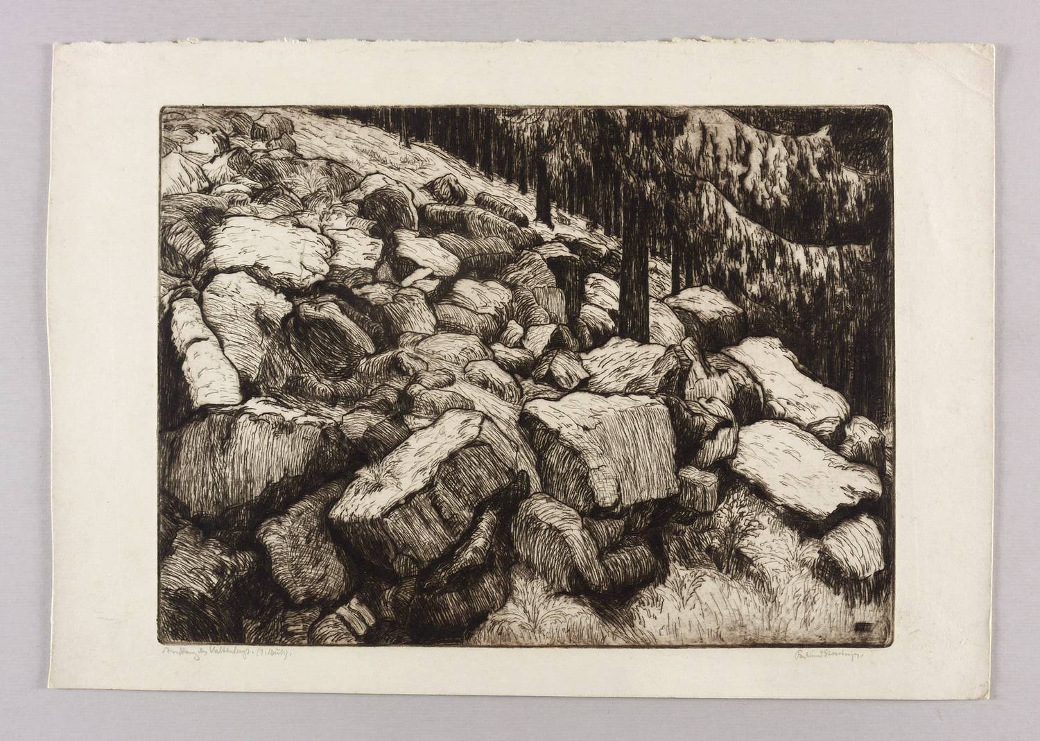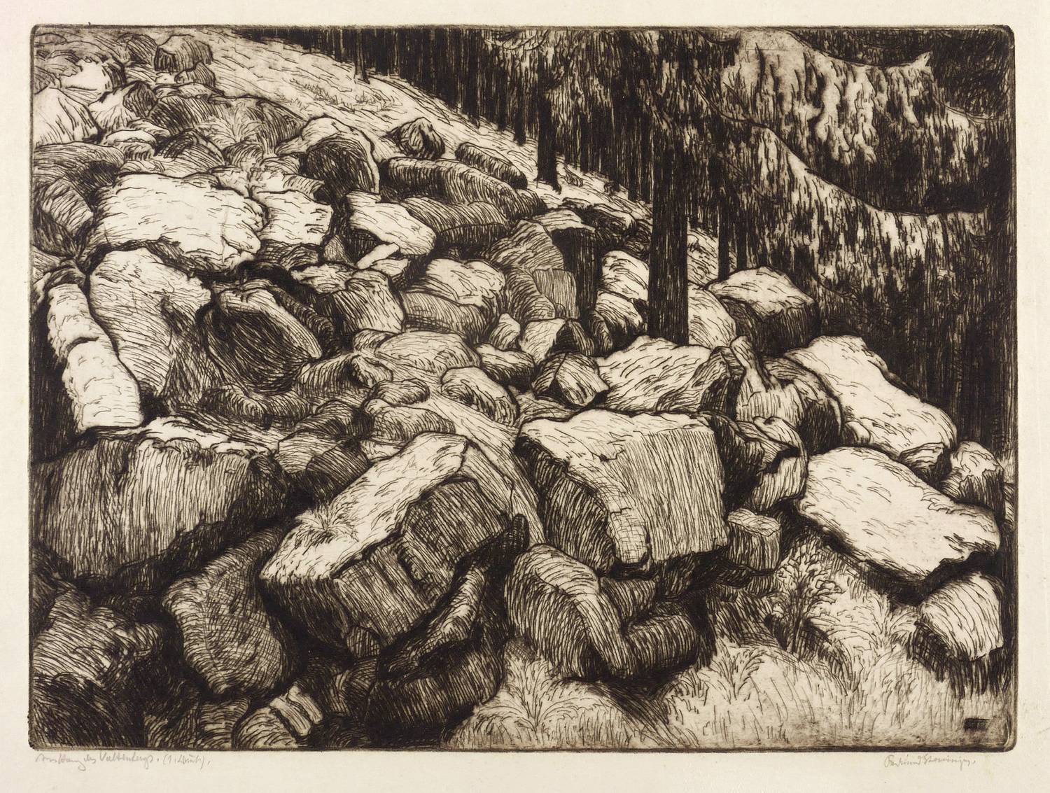 Rechts unten in Bleistift signiert: ″Ferdinand Steiniger.″ Links Titel: ″Am Hang des Valtenbergs.″ Daneben bezeichnet: ″1. Druck″. In der Platte links unten Monogramm und Jahr: ″FST 38″. – Sehr guter Zustand.