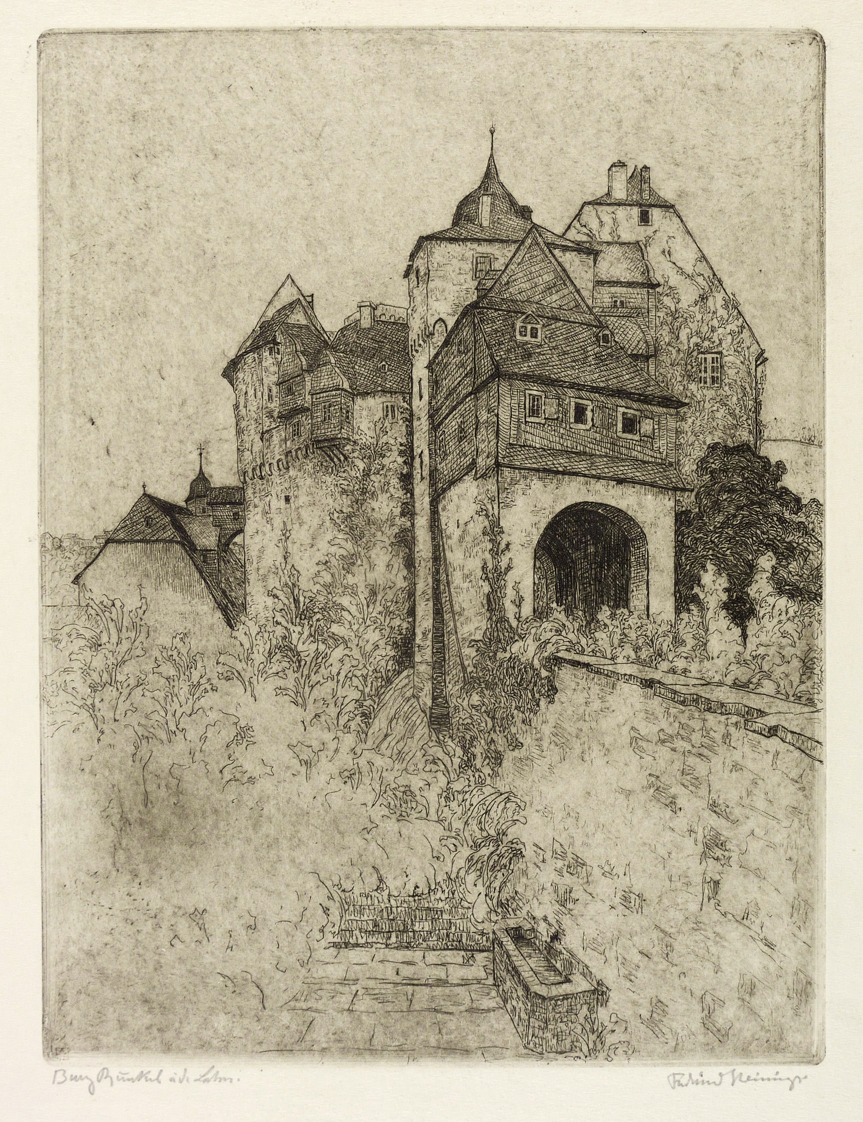 Rechts unten in Bleistift signiert: ″Ferdinand Steiniger.″ Links Titel: ″Burg Runkel a.d. Lahn″. – Tadellos. Sehr guter Zustand.