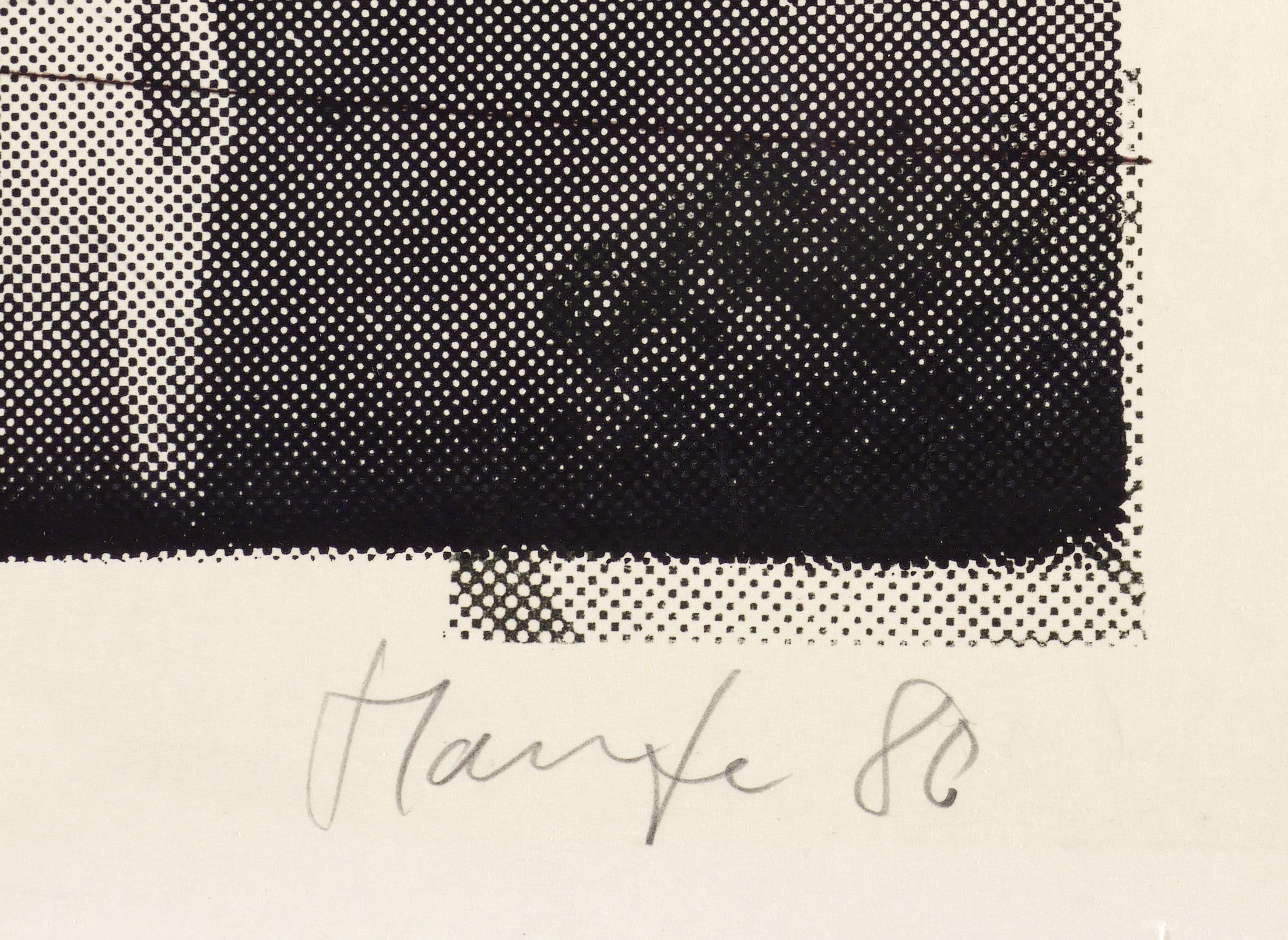 1980. Farbsiebdruck / Farbserigrafie, Irisdruck in Rotbraun & Schwarz, auf hellgelbem Karton. – Originale Künstlergrafik, von Jürgen Haufe. – 42,8 x 57,5 cm (Darstellung / Druckbild), 50 x 65 cm (Blatt).