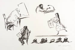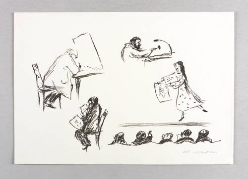 Arno Mohr (1910 Posen - 2001 Berlin). Deutscher Maler und Grafiker in Berlin. 1924-27 Lehre zum Schildermaler in Posen, später dort Geselle. 1929/30 Abendkurse an der Kunstgewerbe- und Handwerkerschule in Posen. Begann 1933/34 ein Studium an der Vereinigten Staatsschule für bildende und angewandte Kunst in Berlin-Charlottenburg. 1946-75 Professur an der Hochschule für bildende und angewandte Kunst in Berlin-Weißensee. Gründung der von ihm geleiteten Druckwerkstatt der Kunsthochschule inspiriert durch die Bekanntschaft mit dem Drucker Alfred Erhardt und Otto Dix. Richtete außerdem eine eigene Werkstatt in Berlin-Lichtenberg ein. Sammler von DDR-Grafik schätzen an ihm eine treffende Beobachtung und eine regelrecht zu einer Art Markenzeichen stilisierte sparsam skizzierende Handschrift.