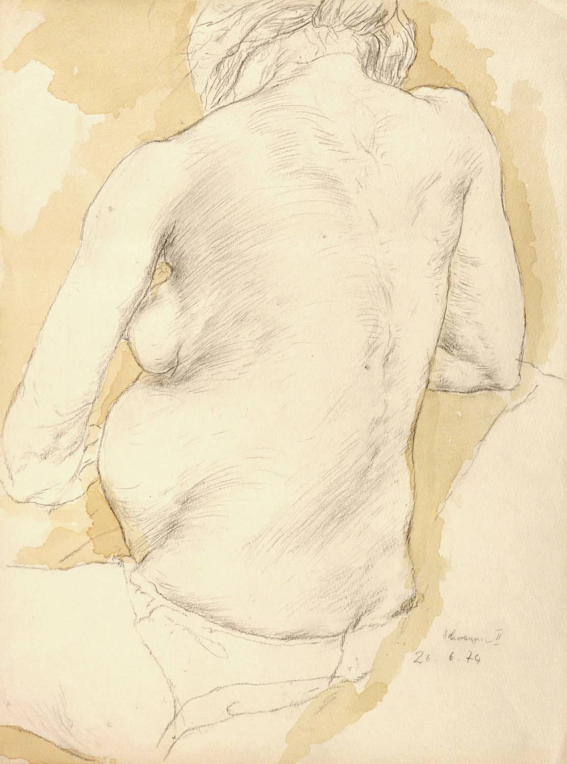 Nicht handsigniert. Rechts eigenhändig in Bleistift bezeichnet und datiert: ″Schwangere II / 26.6.74″. Verso Nachlass-Stempel des Künstlers. – Ecken leicht gestaucht. Insgesamt guter EZustand.