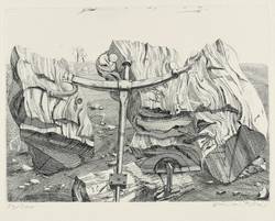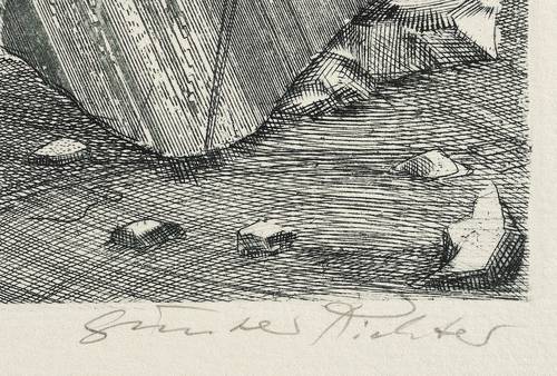 Günter Richter (*1933 Meißen, lebt und arbeitet in Leipzig). Deutscher Maler und Grafiker. 1949-53 Ausbildung zum Bossierer in der Staatlichen Porzellanmanufaktur in Meißen. 1953-58 Studium an der Hochschule für Grafik und Buchkunst in Leipzig (HGB). 1972 Mitbegründer der Leipziger Grafikbörse, 1976-82 Leitung. 1989-92 Lehrer im Jugendstudio des Lindenau-Museums Altenburg. Seit 1990 Dozent an der HGB Leipzig. Ob in Form von zerfallenen Hausfassaden, welkenden Blumen oder Strandgut, Zeit und Verfall ist zentrales Thema fast seines gesamten Werks, das eine surreal verfremdete Romantik kennzeichnet.