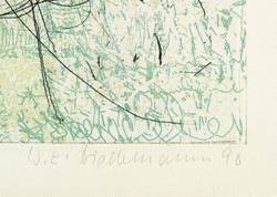 1990. Farbradierung / Strichätzung, in Lindgrün, Türkis & Schwarz, auf schwerem hellchamois Hahnemühle. – Originale Künstlergrafik, von Wolfgang E. Biedermann. – Auflage Exemplar Nr. 41/50. – 33,8 x 44,3 cm (Darstellung / Platte), 40 x 54 cm (Blatt).
