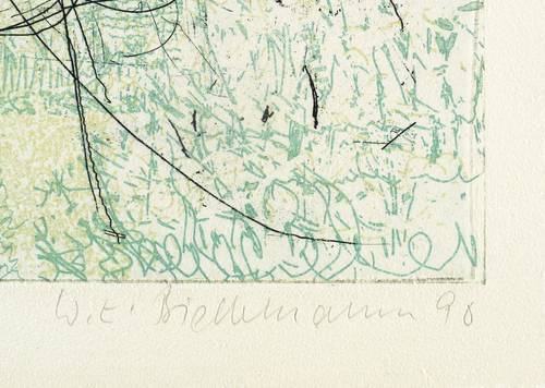 In Bleistift rechts unten signiert und datiert: ″W.E. Biederman 90″. Links Auflagenbezeichnung: ″41/50″. Wasserzeichen der Hanemühle. – Schönere Farbvariante dieser Radierung. – Ohne Tadel. Sehr guter Zustand.