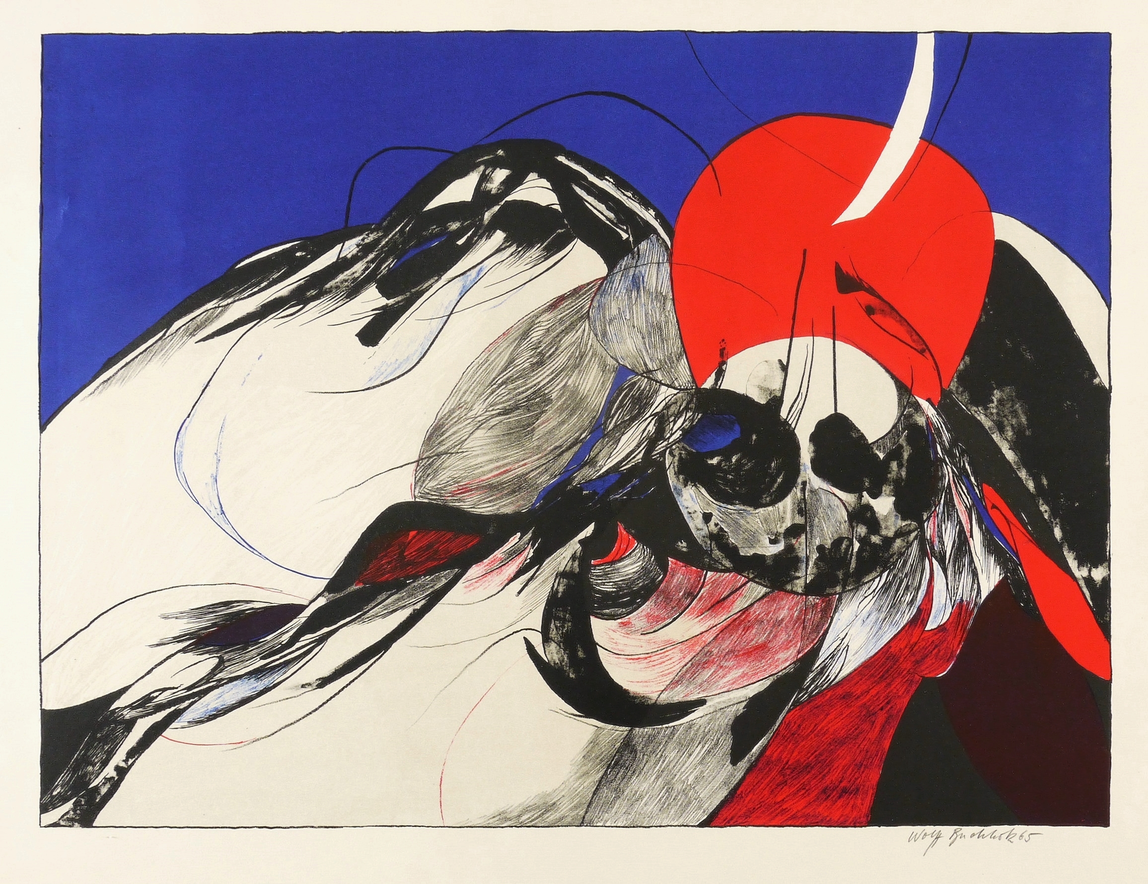 1965. Farblithografie / Kreide- & Pinsellithografie, in Rot, Blau & Schwarz, auf hellchamois Velin. – Originale Künstlergrafik, von Wolff Buchholz. – 50 x 64 cm (Blatt), 38,4 x 51,5 cm (Darstellung / Druckbild).