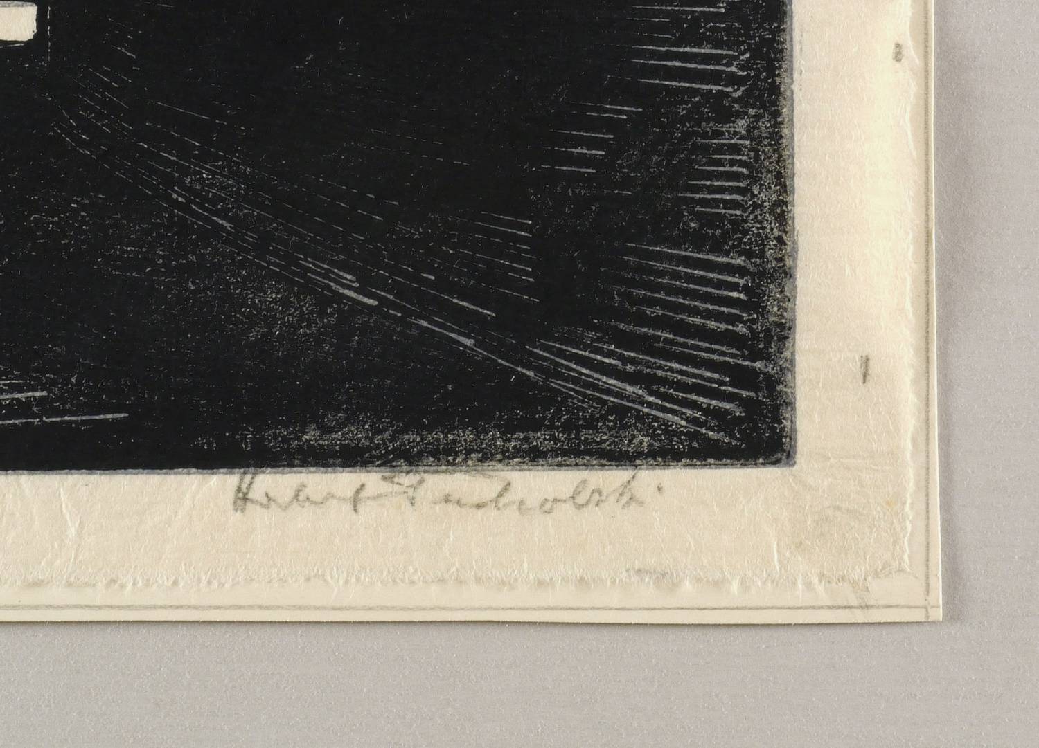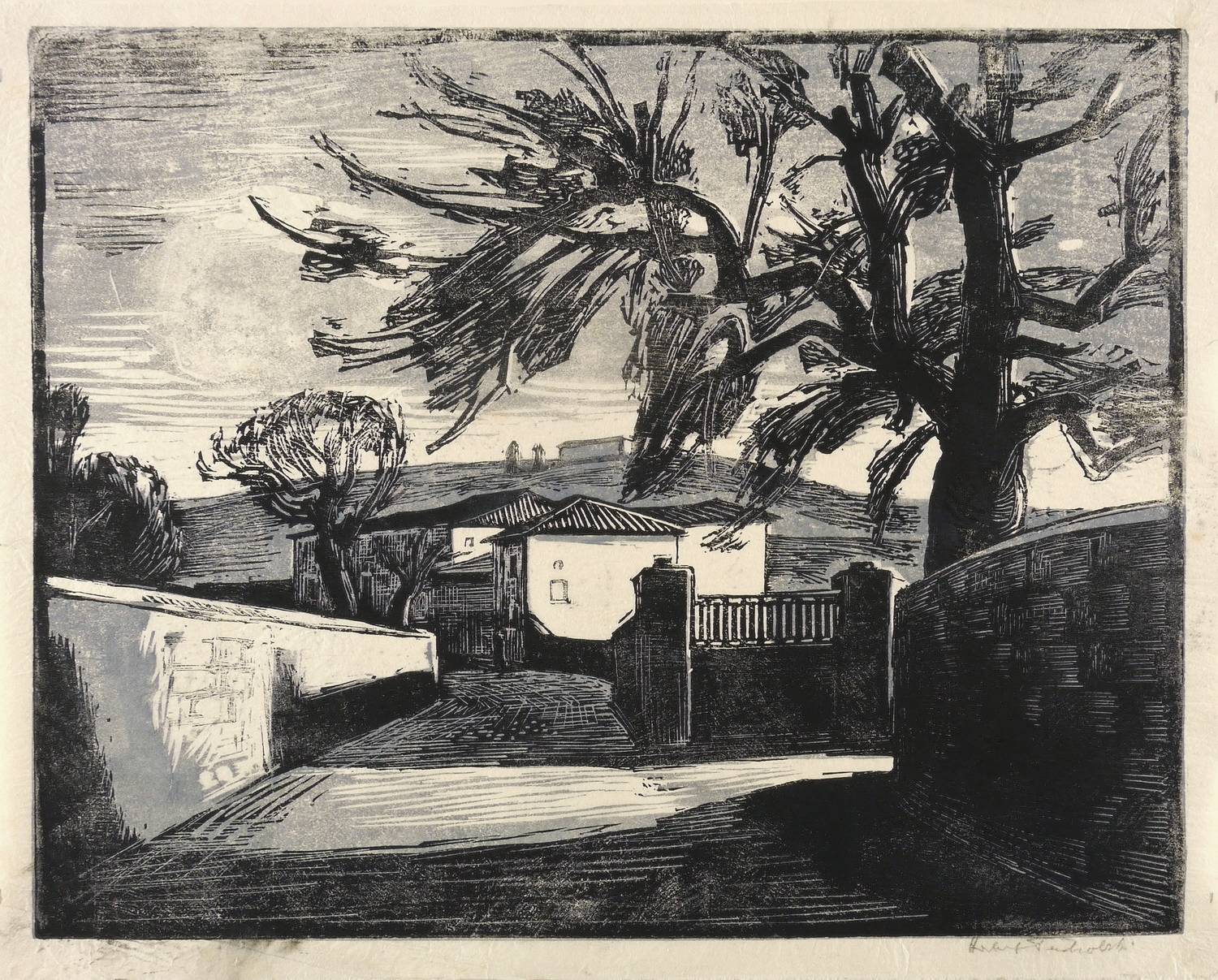 1939. Farbholzschnitt / Clair-obscure, in Hellgrau & Schwarz, auf feinem hellgelbem Japan. – Originale Künstlergrafik, von Herbert Tucholski. – 30,5 x 38,5 cm (Darstellung / Druckstock), 33 x 42 cm (Blatt).