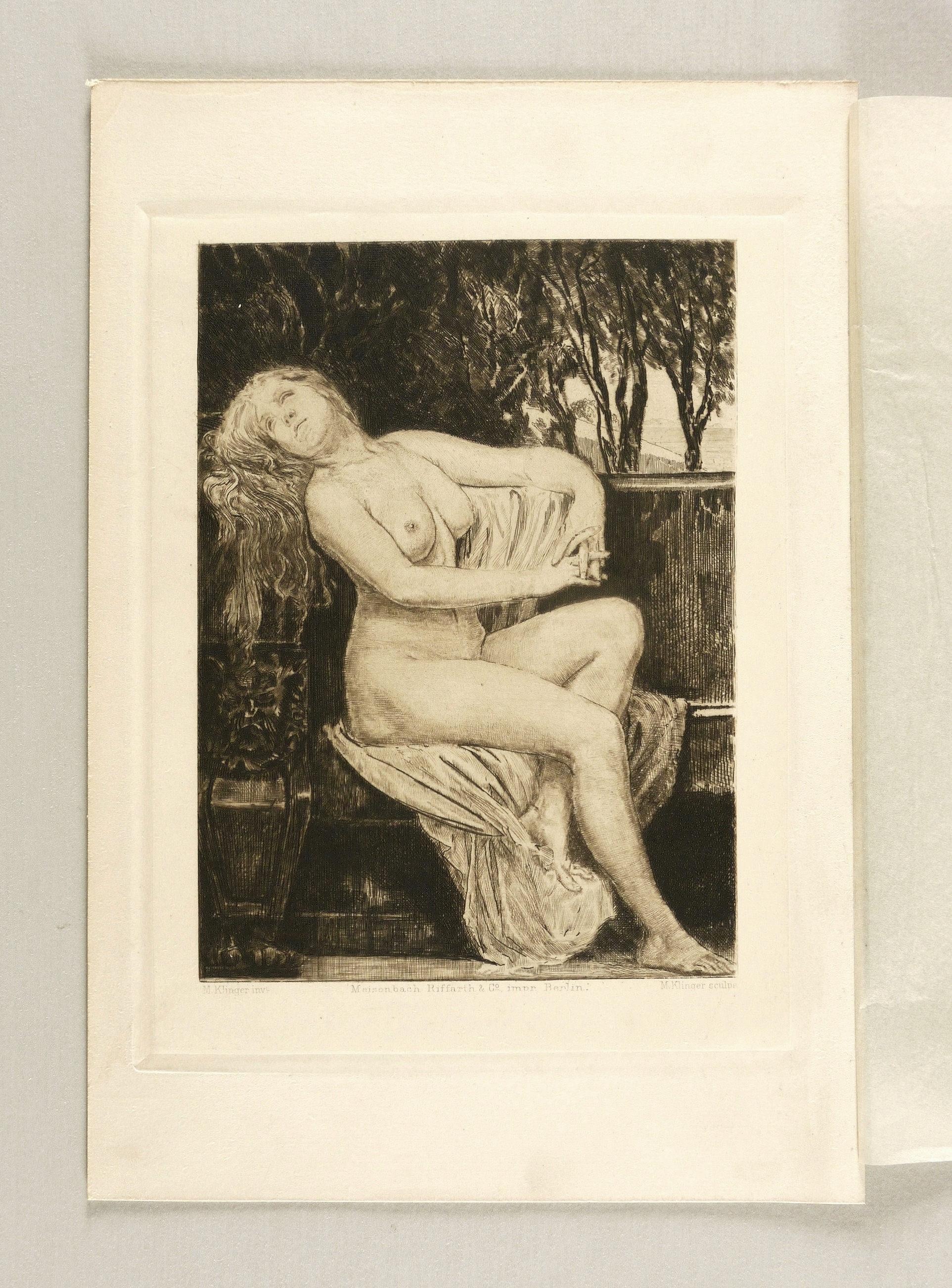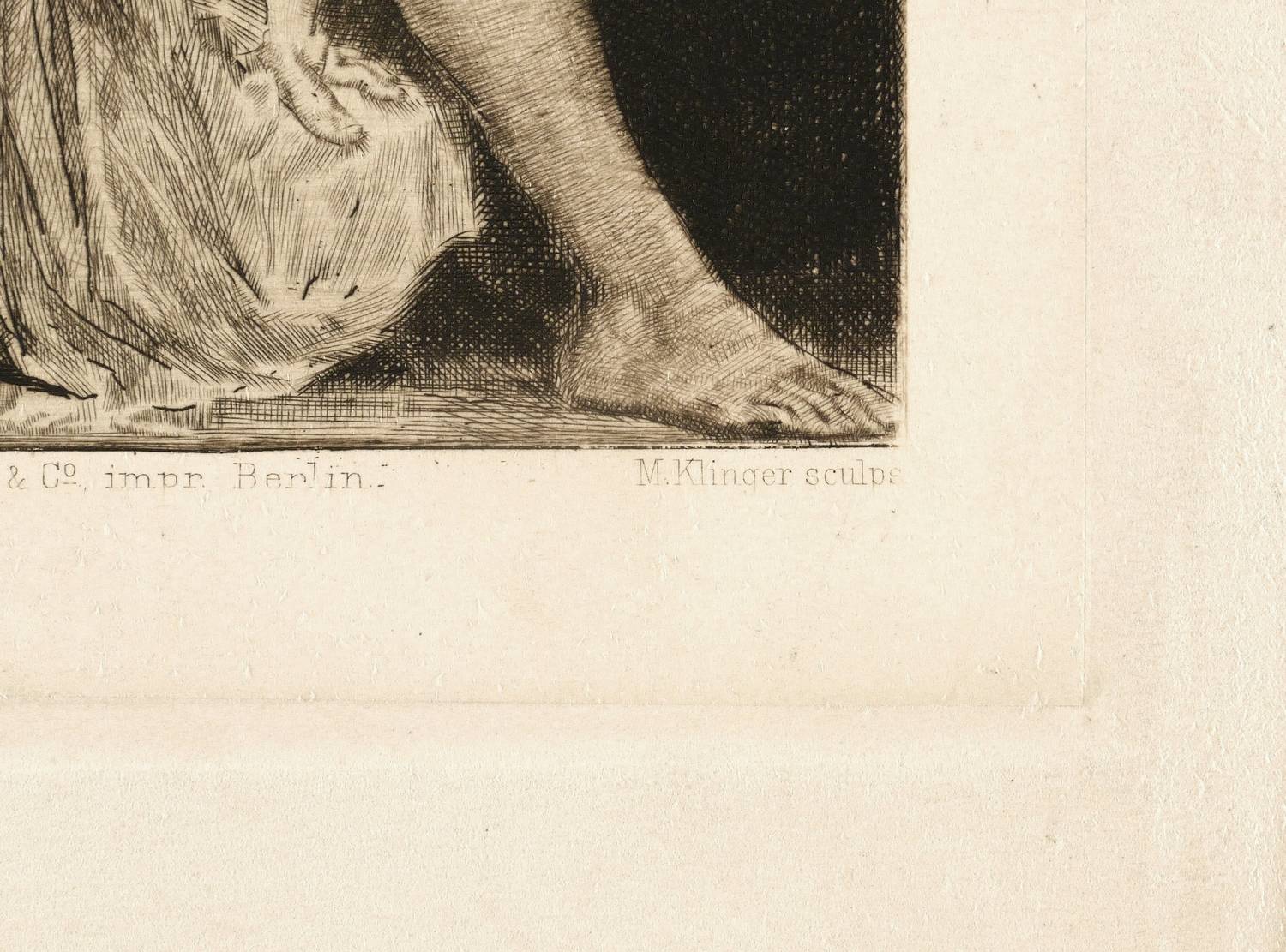 Singer 285 IV (von IV). – Aus: Eduard Grisebach, Der neue Tannhäuser (Stuttgart: Cotta 1885). – Nicht handsigniert. In der Platte rechts unten gestochene Signatur: ″M. Klinger sculps″. Dazu links bezeichnet: ″M. Klinger inv. / Meissenbach Riffarth & Co, impr. Berlin.″ – Originalradierung von Max Klinger, 1885 als Frontispiz für ″Der neue Tannhäuser″ von Eduard Grisebach entstanden. – Originalrandiges unbeschnittenes Exemplar. Mit dem schützenden Seidenhemdchen. Sehr guter Zustand.