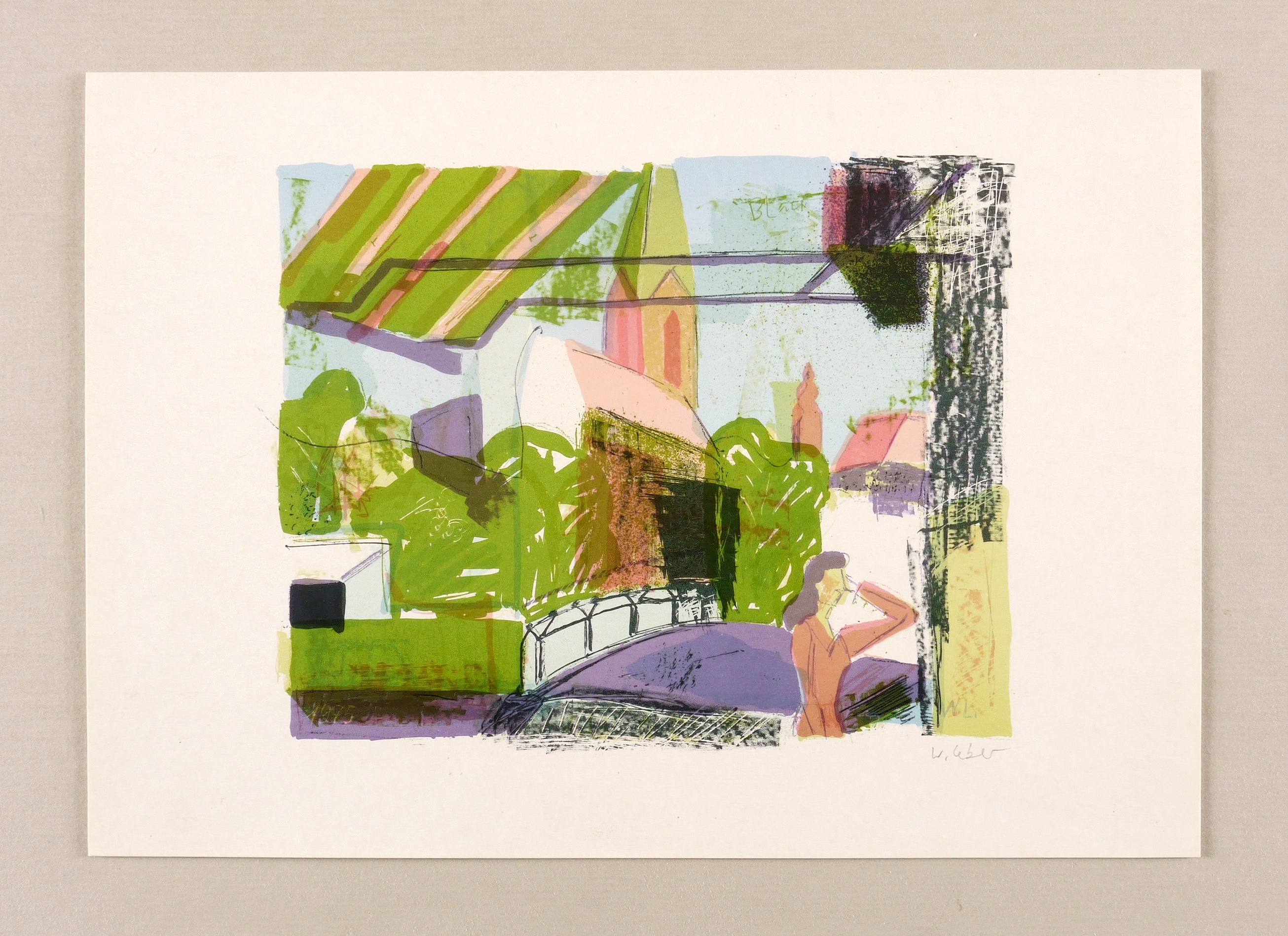 1975. Farblithografie / Kreide- & Pinsellithografie, partiell gespritzt & geschabt, in 8 Farben, auf glattem Karton. – Originale Künstlergrafik, von Wolfgang Leber. – 15,8 x 19,5 cm (Darstellung / Druckbild), 21 x 30 cm (Blatt).