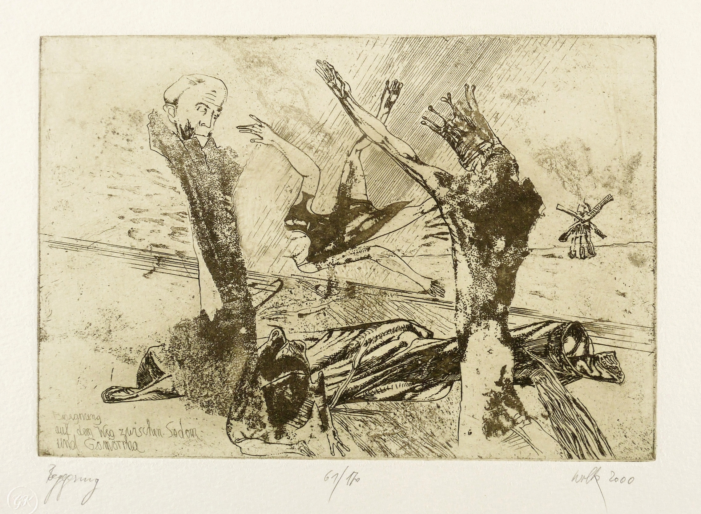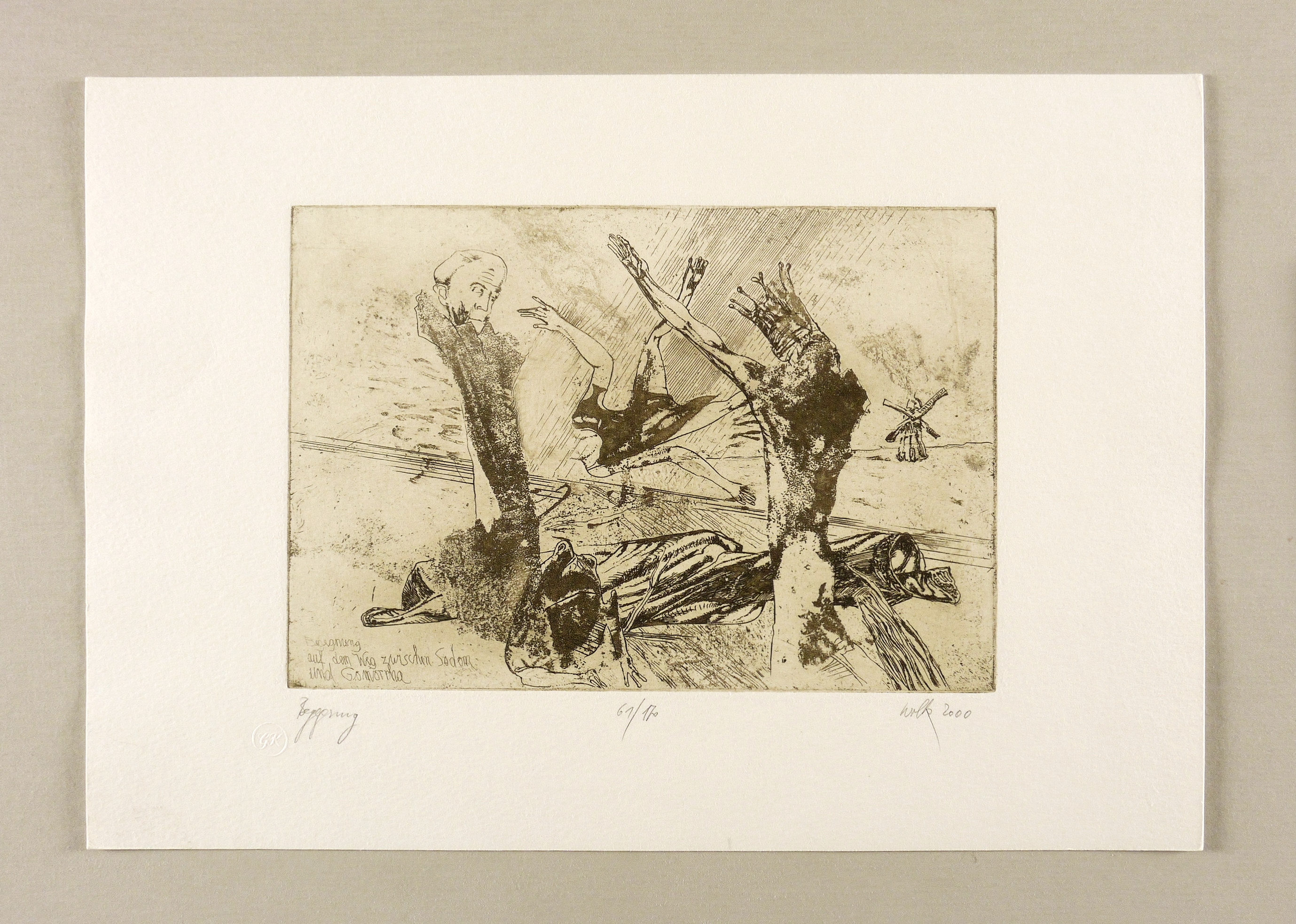 Rechts unten in Bleistift signiert und datiert: ″wolk 2000″. Links Titel: ″Begegnung″. Mittig Auflagenbezeichnung: ″61/170″. – Sehr guter Zustand.