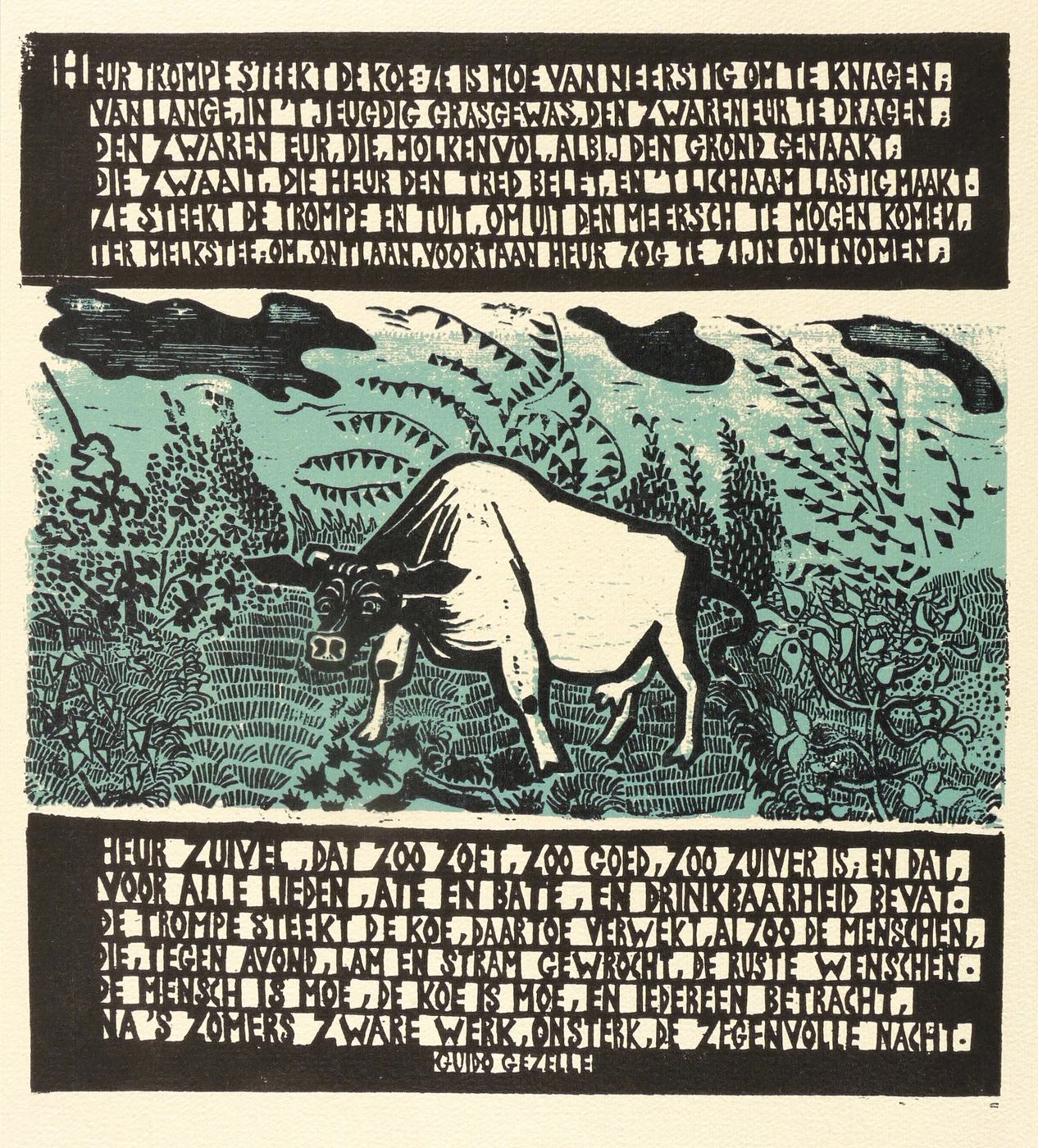 1966. Farbcliché / Zinkätzung, in Blaugrün & Schwarz, auf hellgelbem Maschinenbütten. – Originale Künstlergrafik, von Otto Pankok. – 21,8 x 20,1 cm (Darstellung / Druckstock), 28 x 22 cm (Blatt).