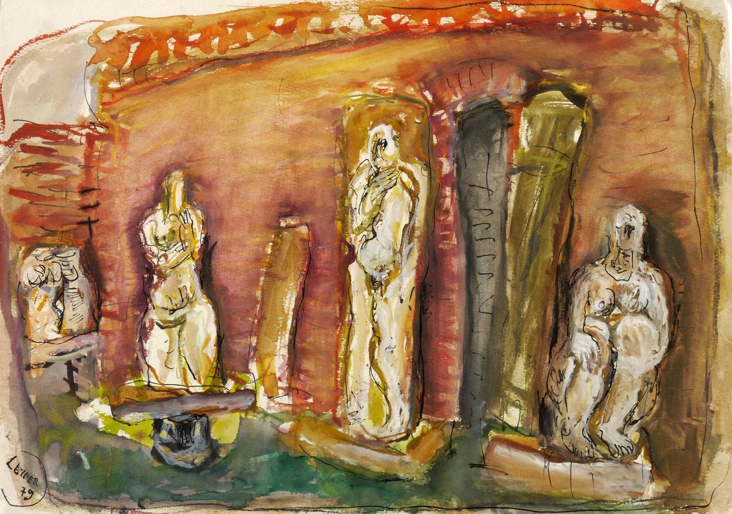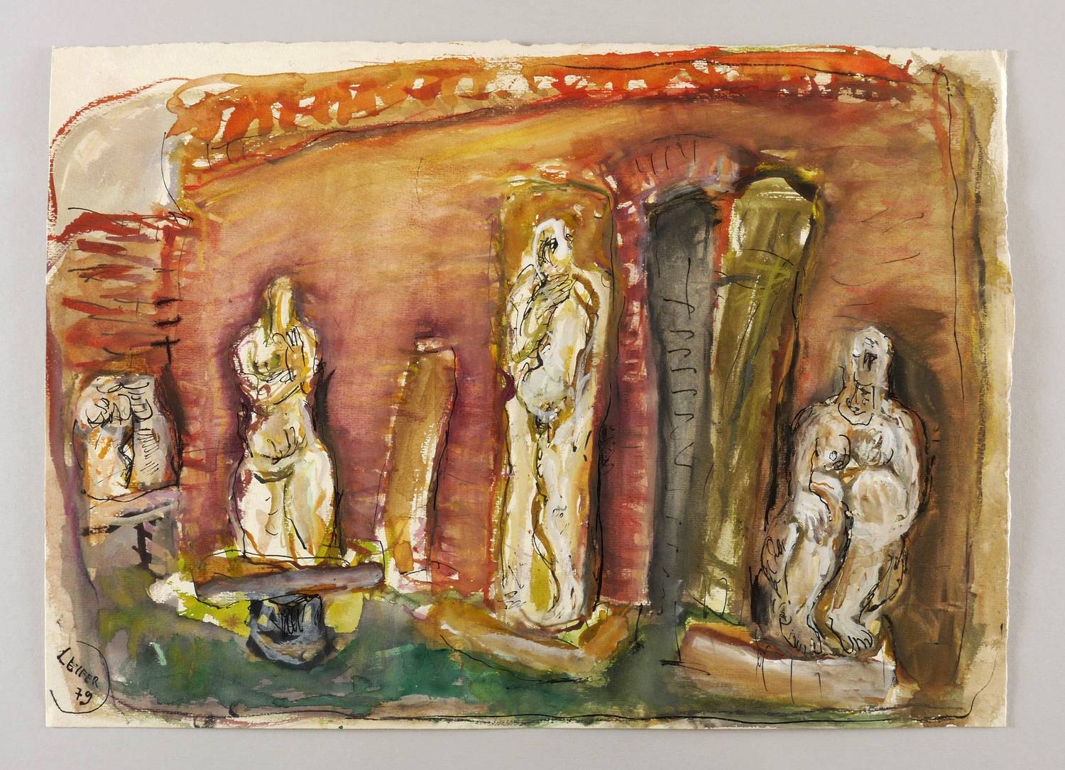 1979. Mischtechnik / Aquarell, Tusche & Gouache, auf schwerem hellchamois Velin. – Originale Künstlergrafik, von Horst Leifer. – Unikat. – 37,0 x 51,7 cm (Darstellung / Blatt).