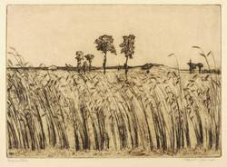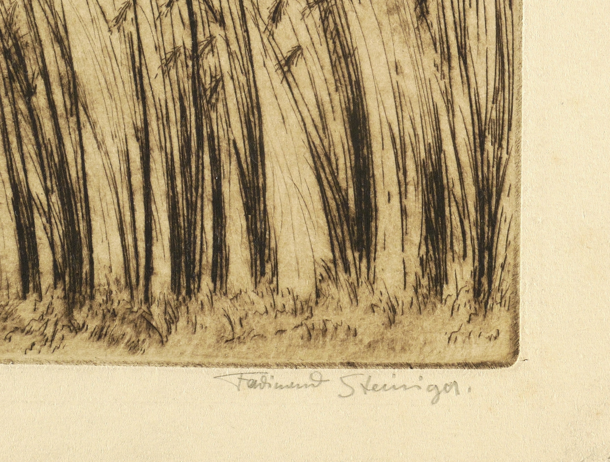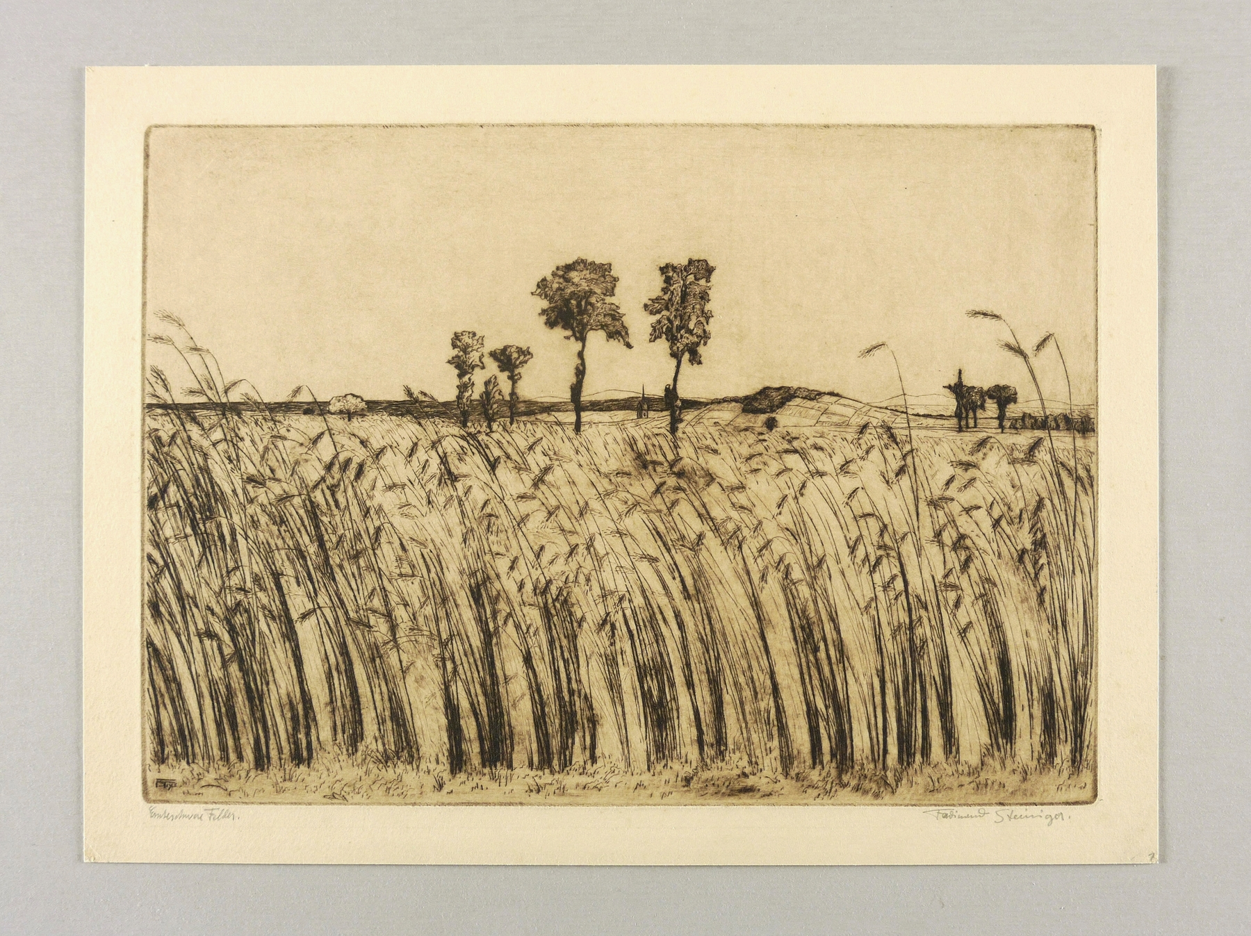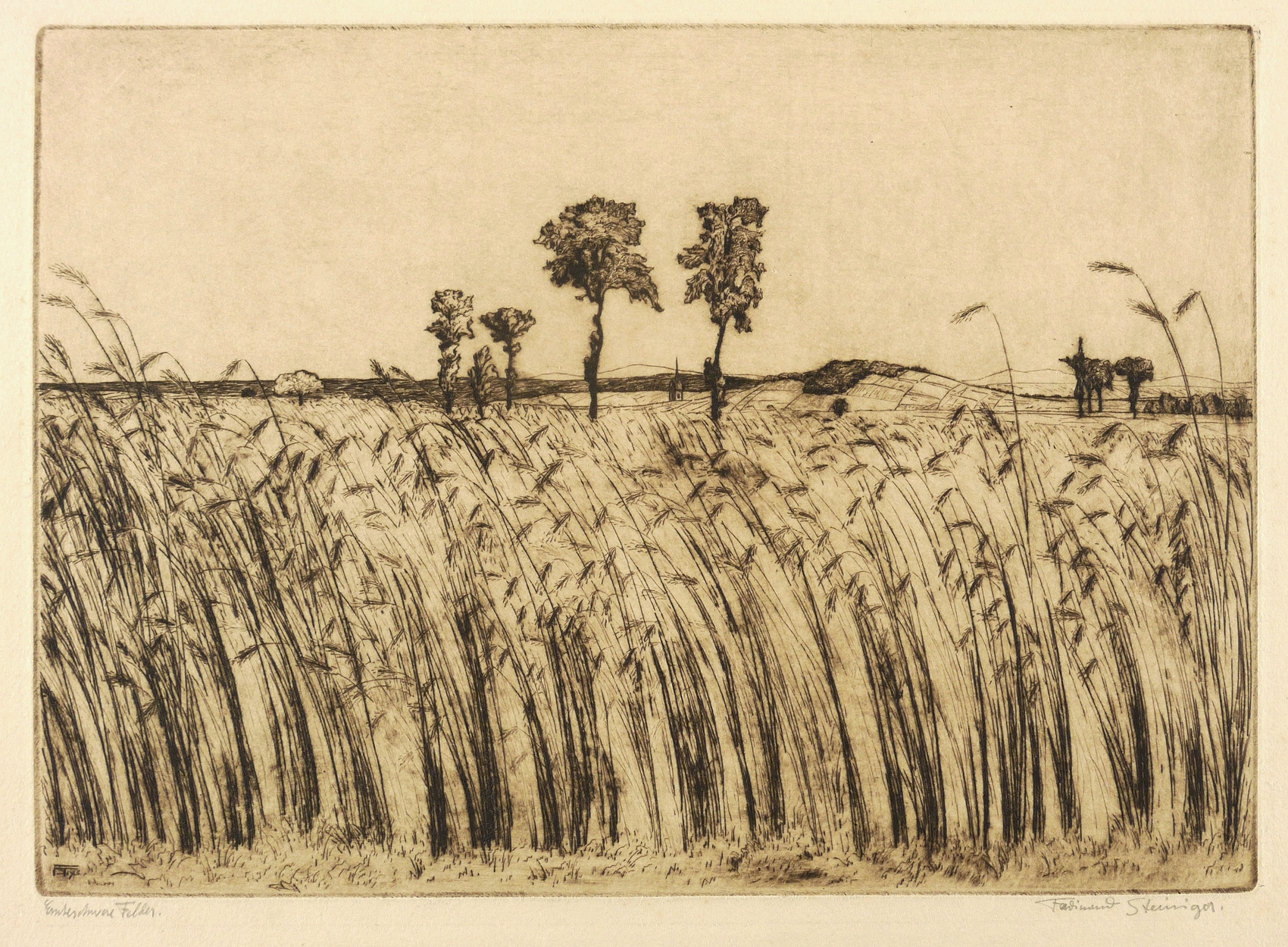 Rechts unten in Bleistift signiert: ″Ferdinand Steiniger.″ Links Titel: ″Ernteschwere Felder.″ In der Platte links unten Monogramm und Jahr: ″FST 1913″. – Sehr guter Zustand.