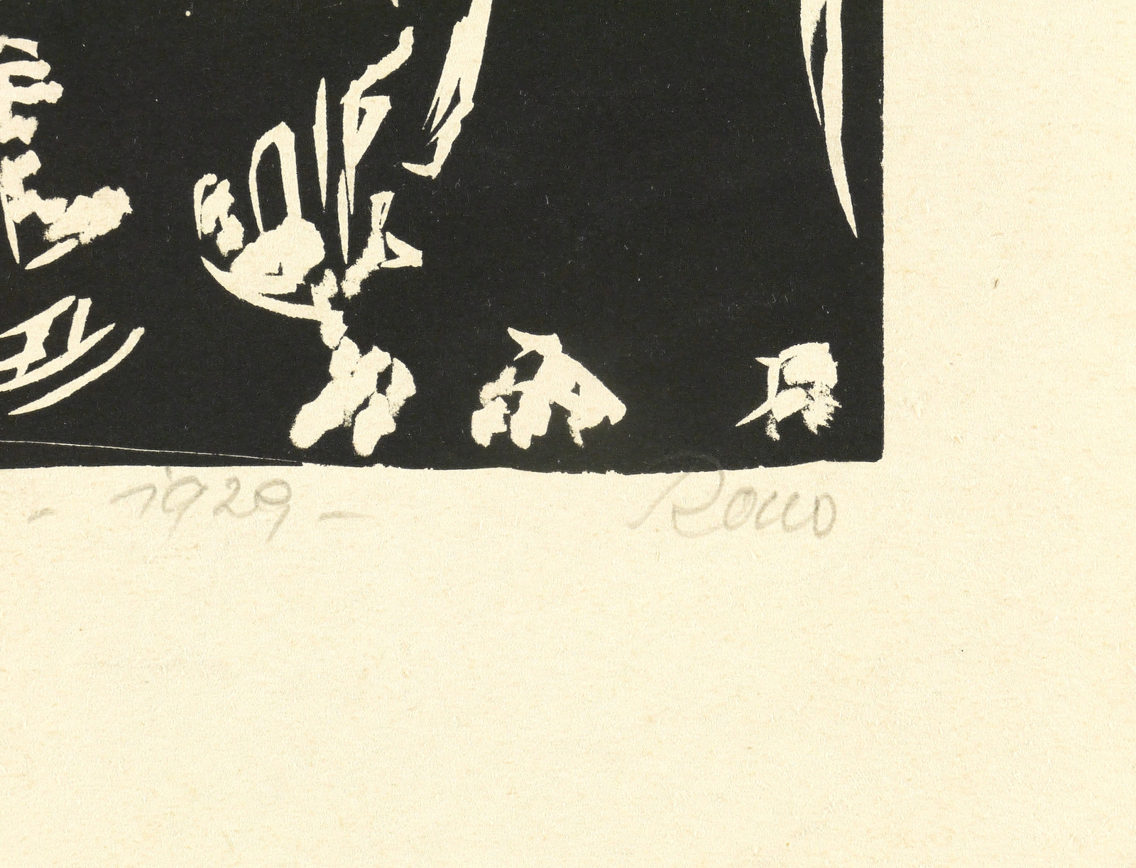 1929. Linolschnitt, in Schwarz, auf leichtem gelbem Werkdruck. – Originale Künstlergrafik, von Werner Rocco. – 28,6 x 18,5 cm (Darstellung / Druckbild), 37 x 25 cm (Blatt).
