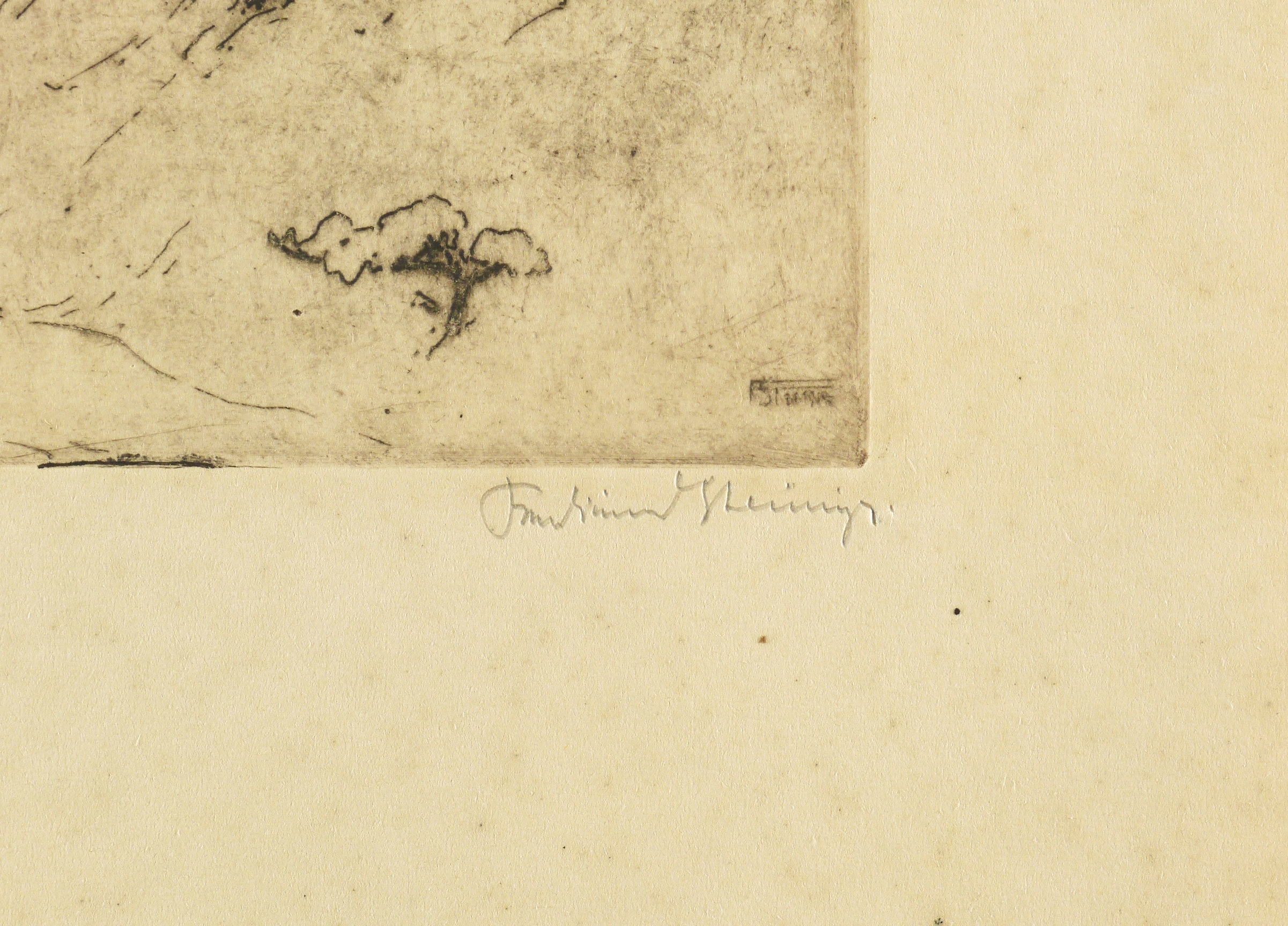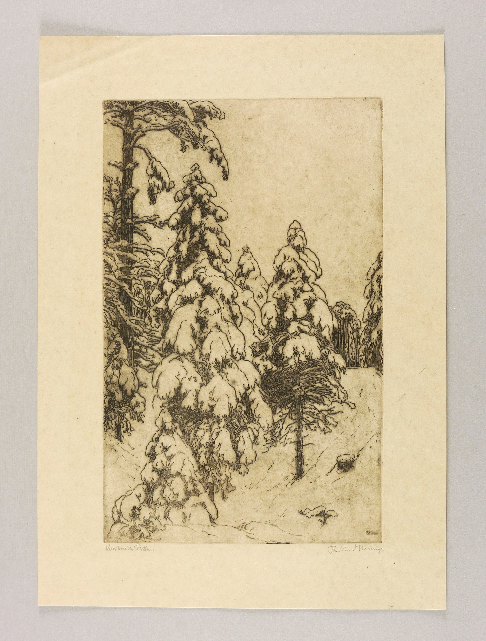 Rechts unten in Bleistift signiert: ″Ferdinand Steiniger.″ Links Titel: ″Verschneite Fichten″. In der Platte rechts unten Monogramm und Jahr: ″FST 1914″. – Papier unmerklich fleckig. Guter Zustand.